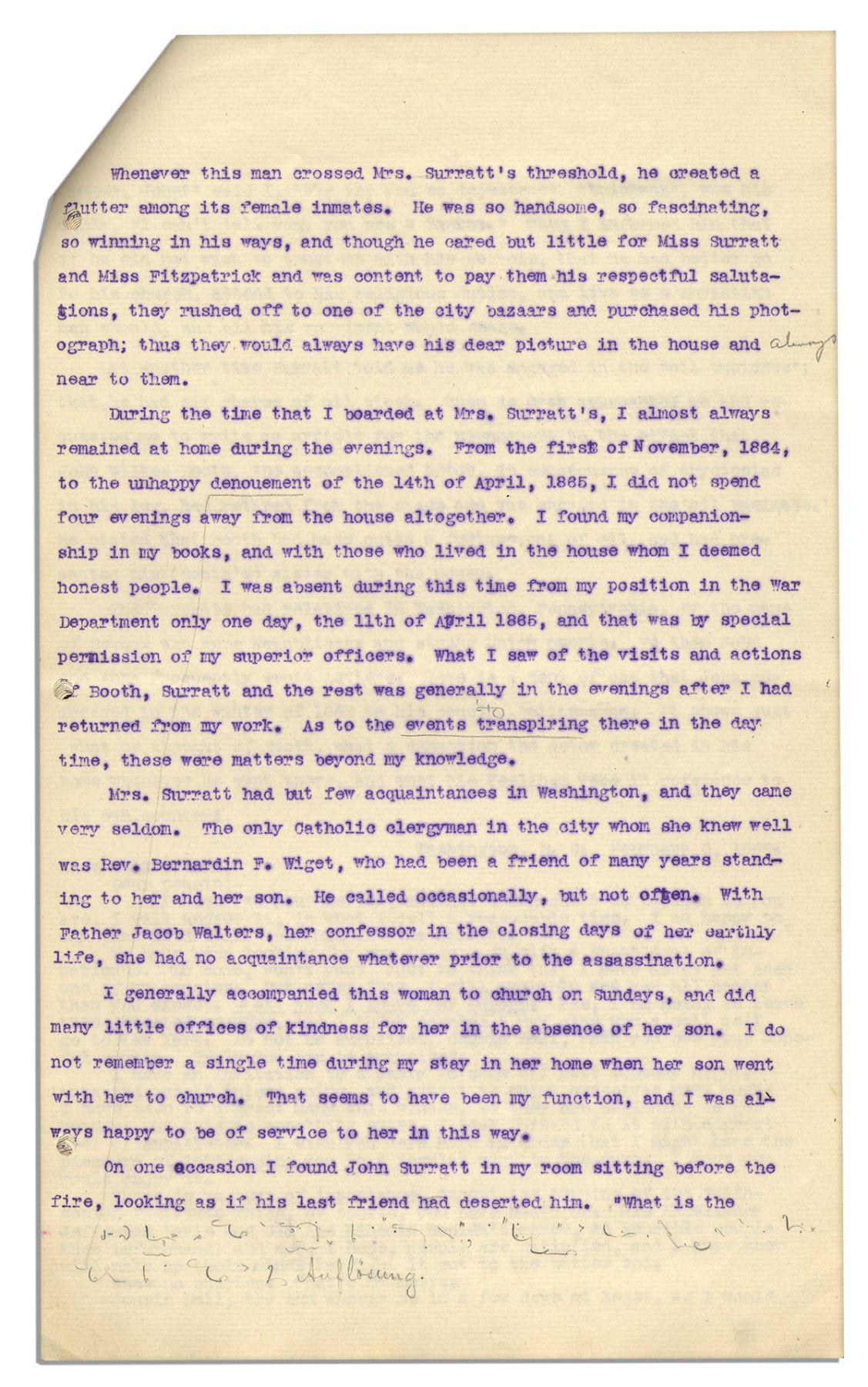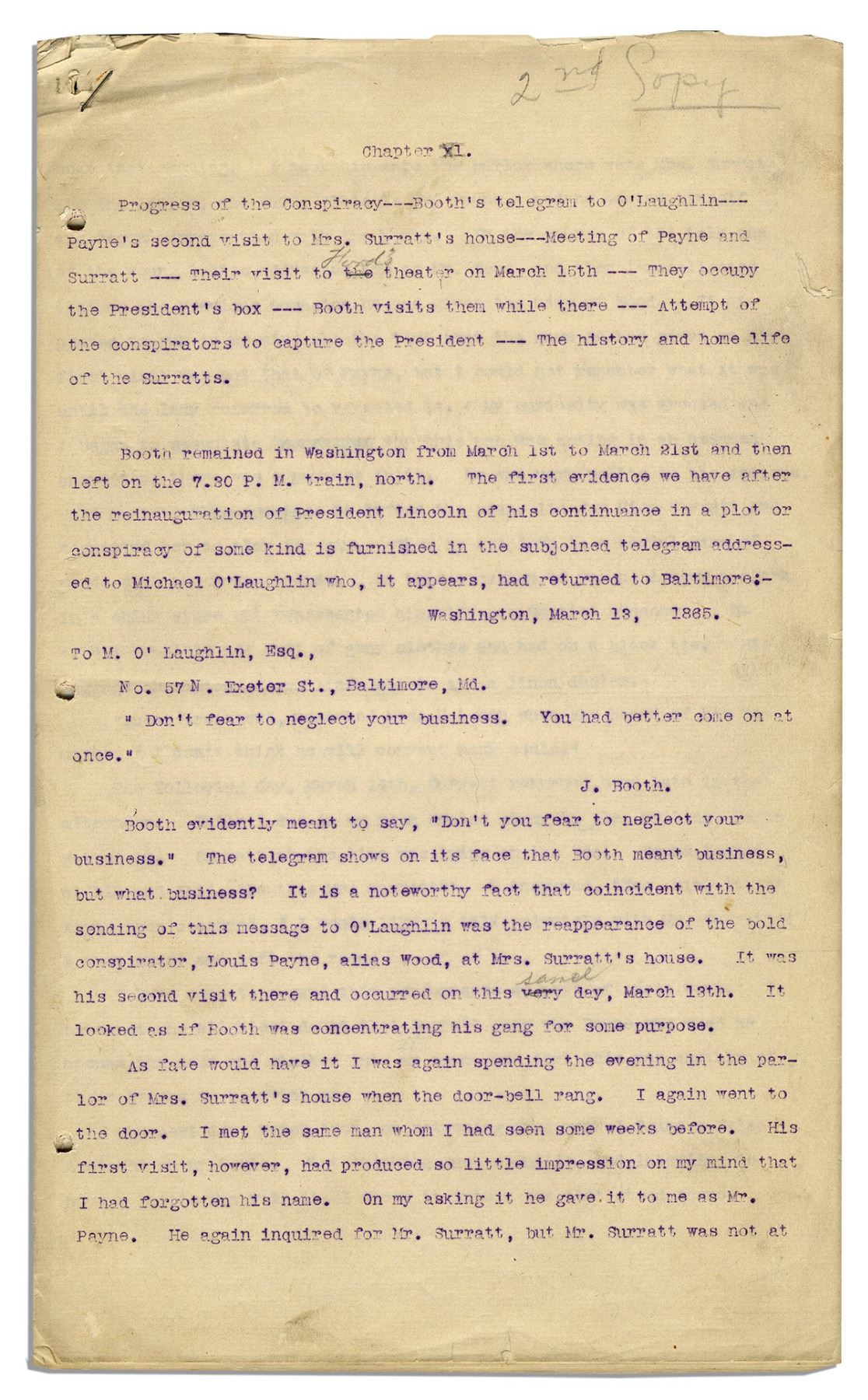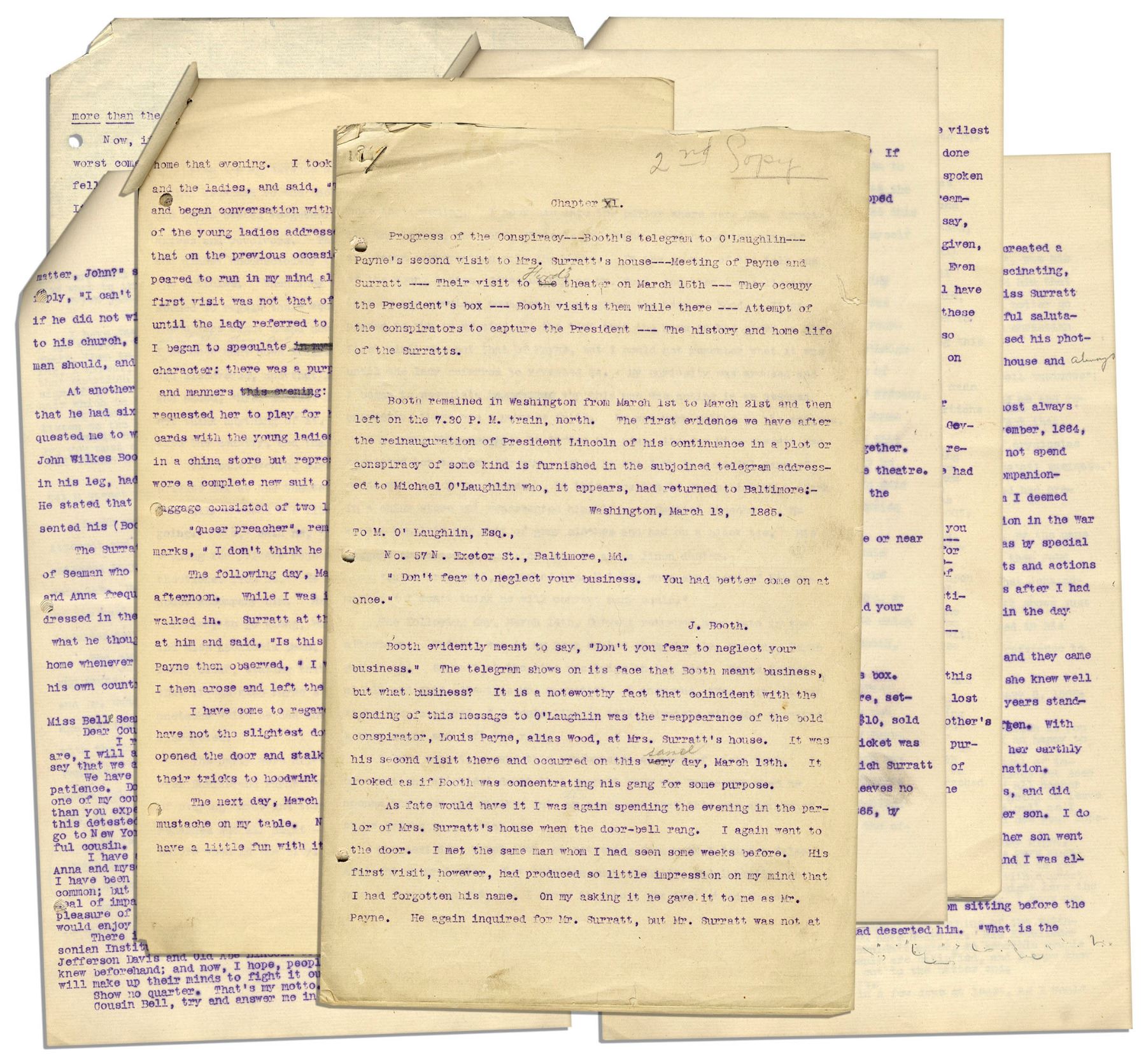 Draft of chapter 11 of Louis Weichmann's autobiographical work, ''A True History of the Assassination of Abraham Lincoln and of the Conspiracy of 1865''. Weichmann, former friend of the Surratt family and then chief prosecution witness at their trial, corresponded with people involved in the events while writing his book on the assassination. Weichmann had been a boarder at Mary Surratt's home when it served as headquarters for John Wilkes Booth and John Surratt, and it was his testimony that led to the conviction and ultimate execution of Mary Surratt. Many years after the tragedy, Weichmann wrote this book to clear his name from suspicions that abounded following his testimony against his housemates. Chapter is summarized at top, ''Progress of the Conspiracy -- Booth's telegram to O'Laughlin -- Payne's second visit to Mrs. Surratt's house -- Meeting of Payne and Surratt -- Their visit to Ford's theater on March 15th -- They occupy the President's box -- Booth visits them while there -- Attempt of the conspirators to capture the President -- The history and home life of the Surratts.'' Chapter summarizes the scheming and plotting, and overall unusual behavior Weichmann witnessed as a border in the house. He details meetings between Surratt and the other co-conspirators who planned the assassination. Interesting sections include: ''...Arnold said the purpose of the parties in the conspiracy at this time was to abduct or kidnap the President and take him South for the purpose of making the U.S. Government have an exchange of prisoners, or something like that. He also said that his part in the plot was to catch the President when he was thrown out of the box at the theatre. Booth, he said, furnished the arms for all the men...'' And his response to not realizing his roommates were conspiring, ''But no man in my position would have acted differently from what I did; no one would have suspected from the facts stated that these men had that day tried to affect the capture of the President, or that failing, his murder. I always had too high an opinion of John Surratt and his mother to believe them capable of such a crime, but the sad results of the 14th day of April, and the developments growing out of the conspiracy trial, show how utterly mistaken and deceived I was in them...'' Runs 20pp. and measures 8'' x 13'', with pencil edits throughout. Three punch holes and staples, toning and light chipping. Last page is detached. Very good condition overall.