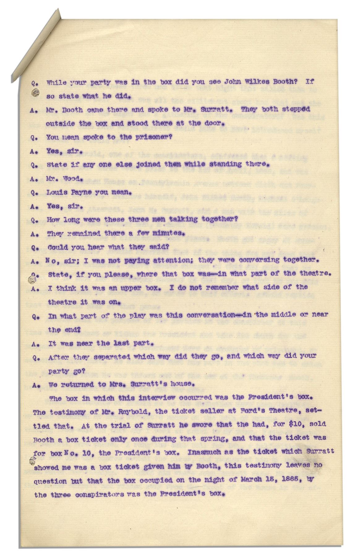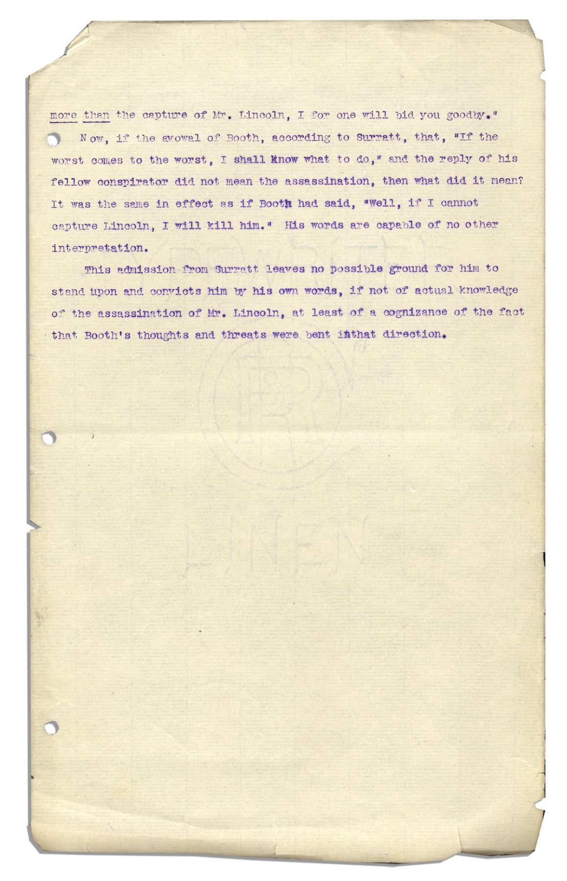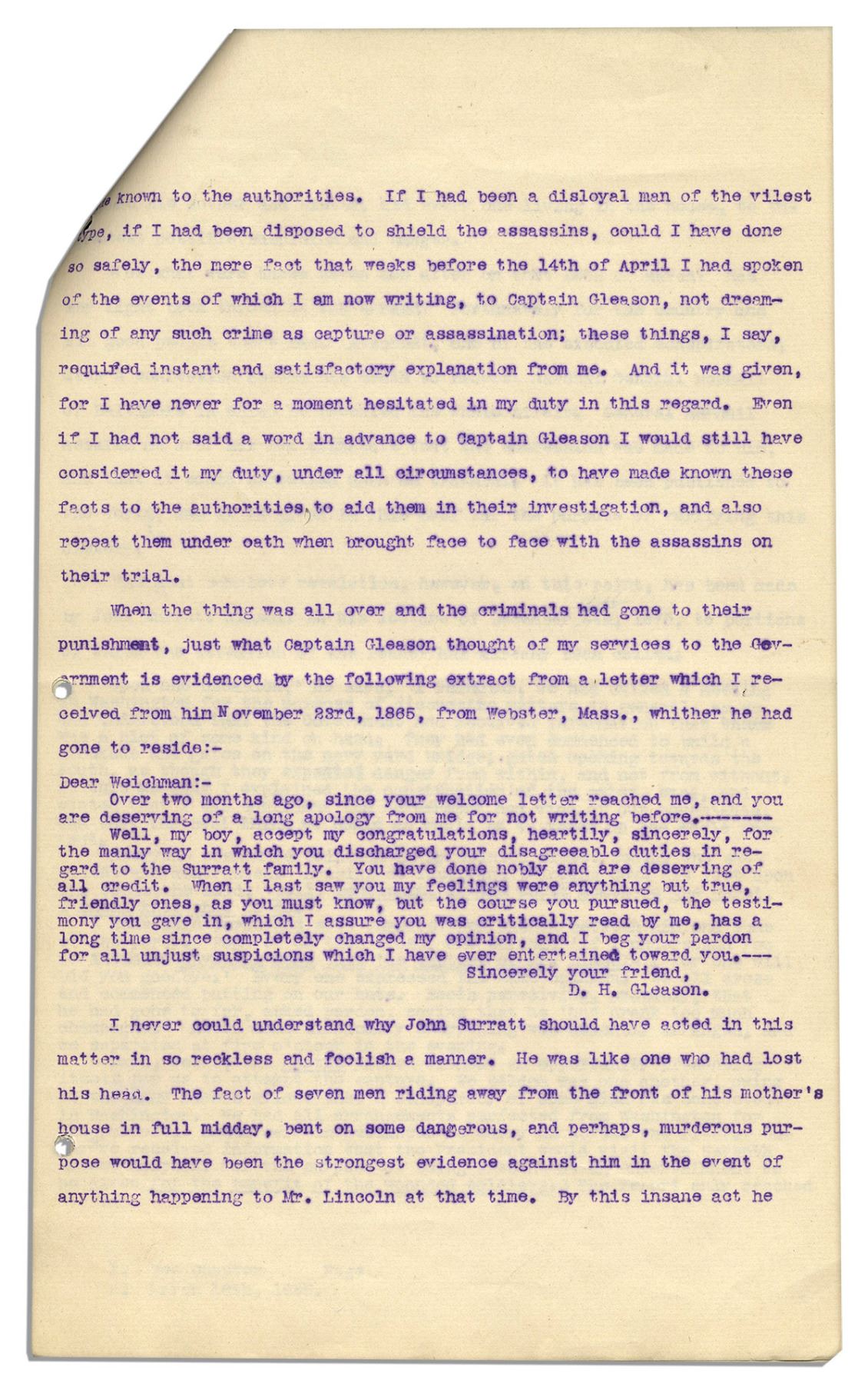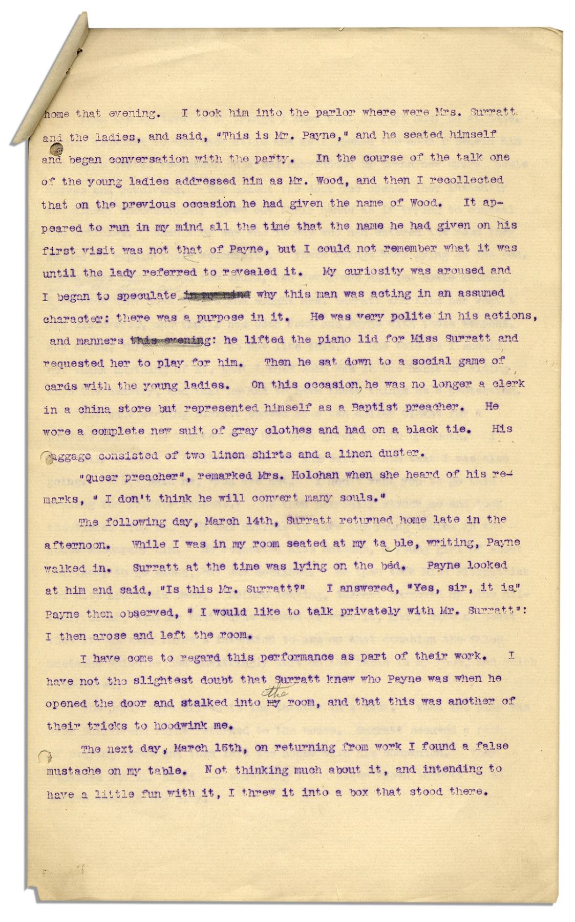 Draft of chapter 11 of Louis Weichmann's autobiographical work, ''A True History of the Assassination of Abraham Lincoln and of the Conspiracy of 1865''. Weichmann, former friend of the Surratt family and then chief prosecution witness at their trial, corresponded with people involved in the events while writing his book on the assassination. Weichmann had been a boarder at Mary Surratt's home when it served as headquarters for John Wilkes Booth and John Surratt, and it was his testimony that led to the conviction and ultimate execution of Mary Surratt. Many years after the tragedy, Weichmann wrote this book to clear his name from suspicions that abounded following his testimony against his housemates. Chapter is summarized at top, ''Progress of the Conspiracy -- Booth's telegram to O'Laughlin -- Payne's second visit to Mrs. Surratt's house -- Meeting of Payne and Surratt -- Their visit to Ford's theater on March 15th -- They occupy the President's box -- Booth visits them while there -- Attempt of the conspirators to capture the President -- The history and home life of the Surratts.'' Chapter summarizes the scheming and plotting, and overall unusual behavior Weichmann witnessed as a border in the house. He details meetings between Surratt and the other co-conspirators who planned the assassination. Interesting sections include: ''...Arnold said the purpose of the parties in the conspiracy at this time was to abduct or kidnap the President and take him South for the purpose of making the U.S. Government have an exchange of prisoners, or something like that. He also said that his part in the plot was to catch the President when he was thrown out of the box at the theatre. Booth, he said, furnished the arms for all the men...'' And his response to not realizing his roommates were conspiring, ''But no man in my position would have acted differently from what I did; no one would have suspected from the facts stated that these men had that day tried to affect the capture of the President, or that failing, his murder. I always had too high an opinion of John Surratt and his mother to believe them capable of such a crime, but the sad results of the 14th day of April, and the developments growing out of the conspiracy trial, show how utterly mistaken and deceived I was in them...'' Runs 20pp. and measures 8'' x 13'', with pencil edits throughout. Three punch holes and staples, toning and light chipping. Last page is detached. Very good condition overall.