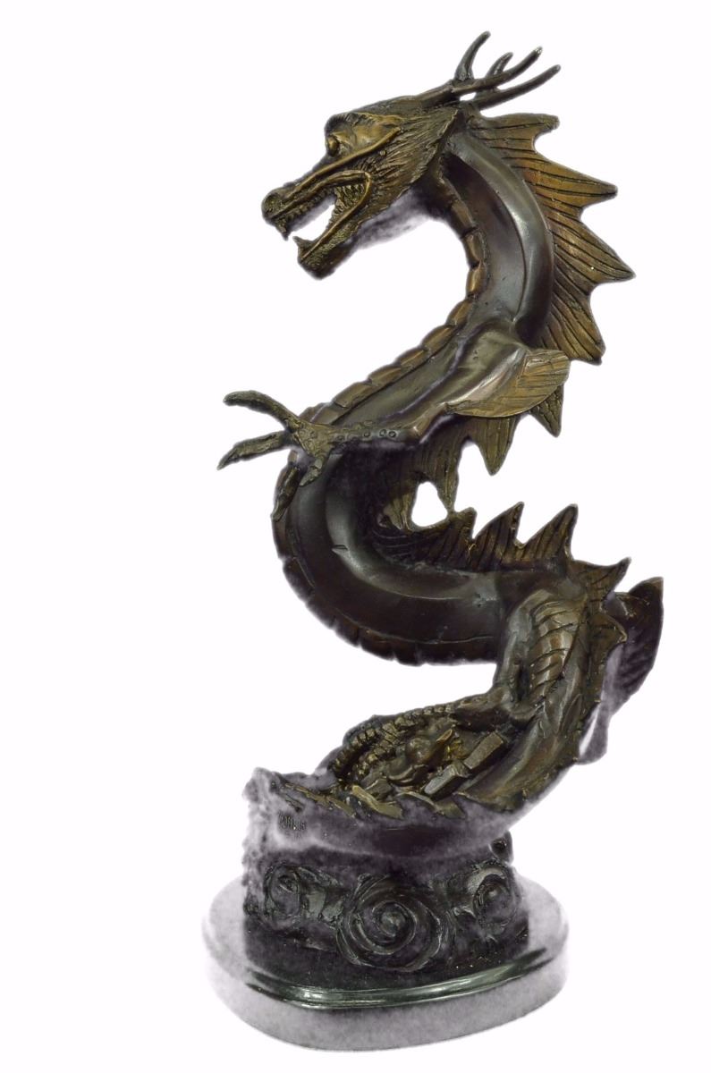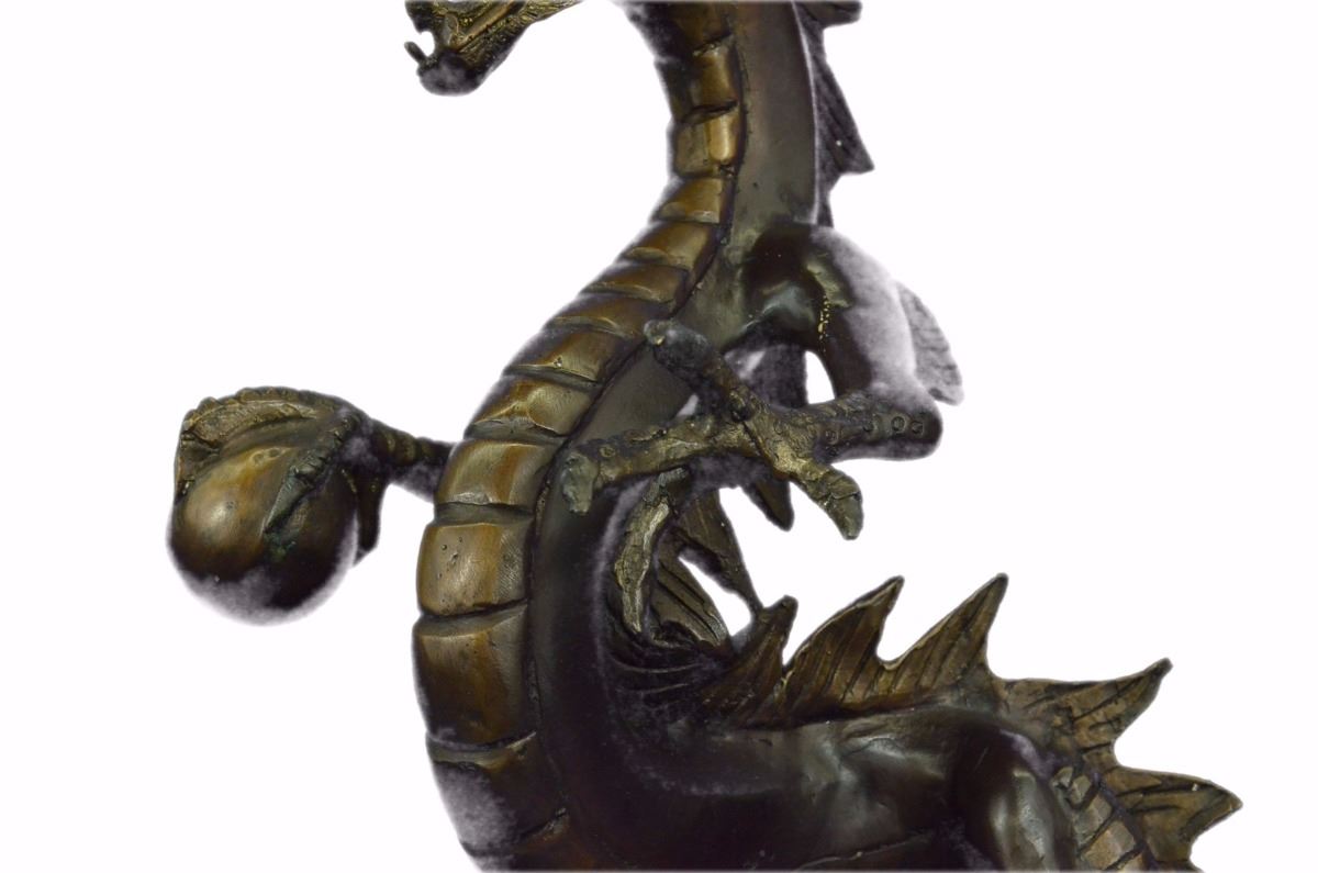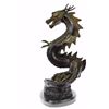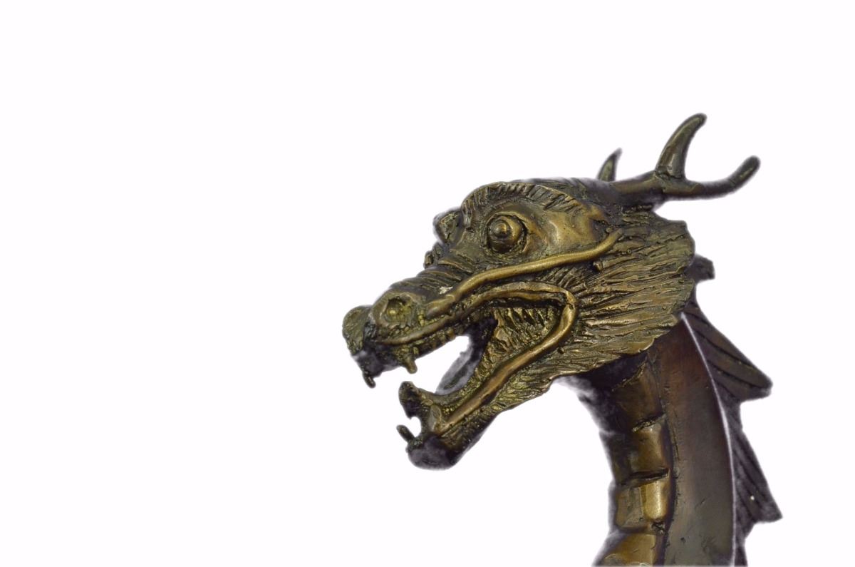 This Large Dragon Sculpture Statue/Feng Shui Cure Is Made Of Solid Bronze And Wonderfully Crafted With Lifelike Details. Oriental Dragon Is A Symbol Of Power, Strength, Good Luck And It Will Make A Great Home/Office Decoration. In "Yin Yang" Terminology, A Dragon Is A Powerful And Auspicious Traditional Feng Shui Cure And A Symbol Of Strong Yang (Male) Energy. 100% Bronze And Handmade, This Limited Edition Brown Patina Sculpture Was Cast Using The "Lost Wax Method" And Mounted On A Marble Base. Bronze Dimensions With Marble Base: Height 19 X Width 9 inches. Weight: 20 Lbs.
