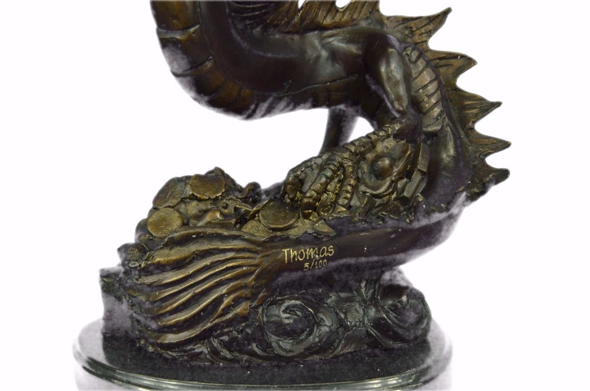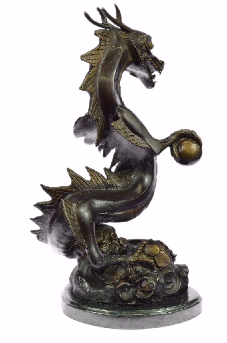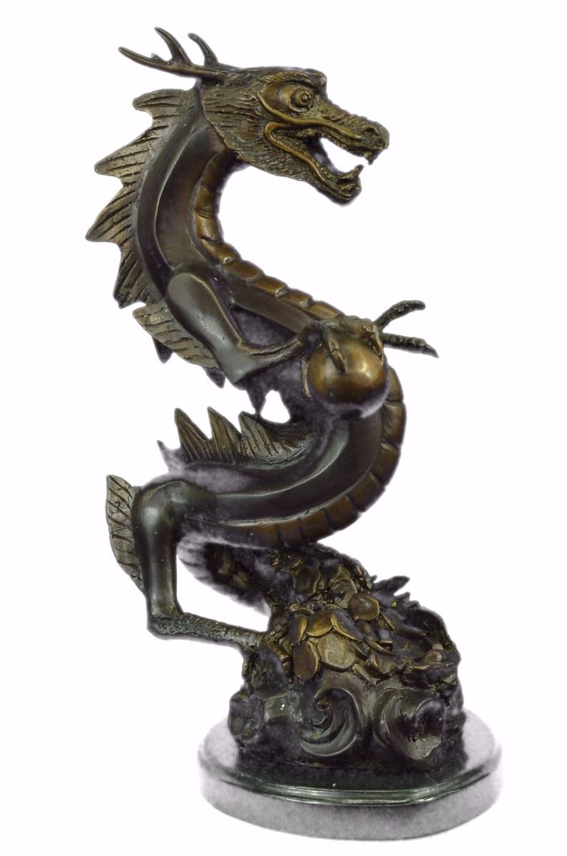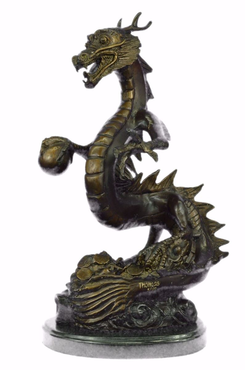 This Large Dragon Sculpture Statue/Feng Shui Cure Is Made Of Solid Bronze And Wonderfully Crafted With Lifelike Details. Oriental Dragon Is A Symbol Of Power, Strength, Good Luck And It Will Make A Great Home/Office Decoration. In "Yin Yang" Terminology, A Dragon Is A Powerful And Auspicious Traditional Feng Shui Cure And A Symbol Of Strong Yang (Male) Energy. 100% Bronze And Handmade, This Limited Edition Brown Patina Sculpture Was Cast Using The "Lost Wax Method" And Mounted On A Marble Base. Bronze Dimensions With Marble Base: Height 19 X Width 9 inches. Weight: 20 Lbs.