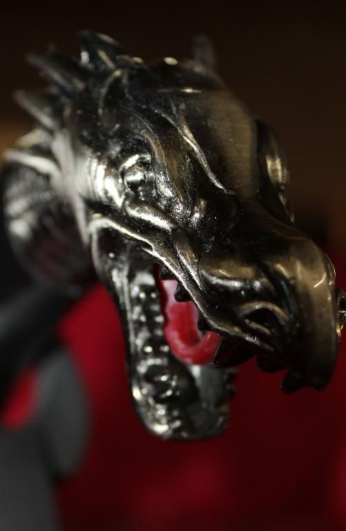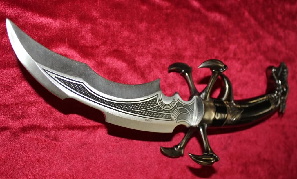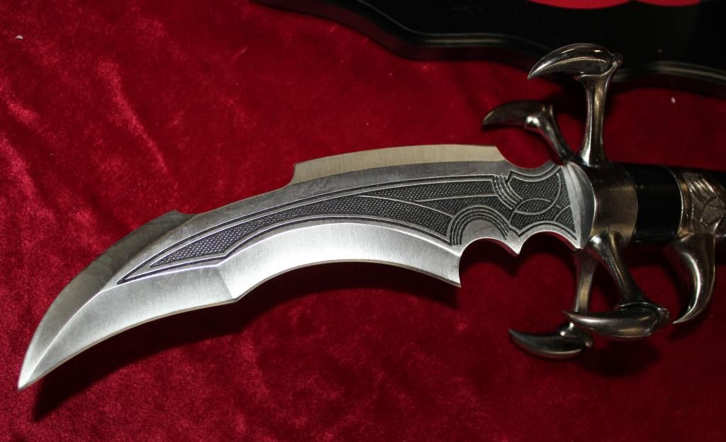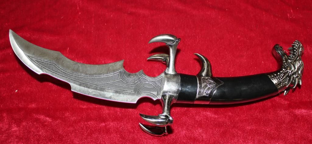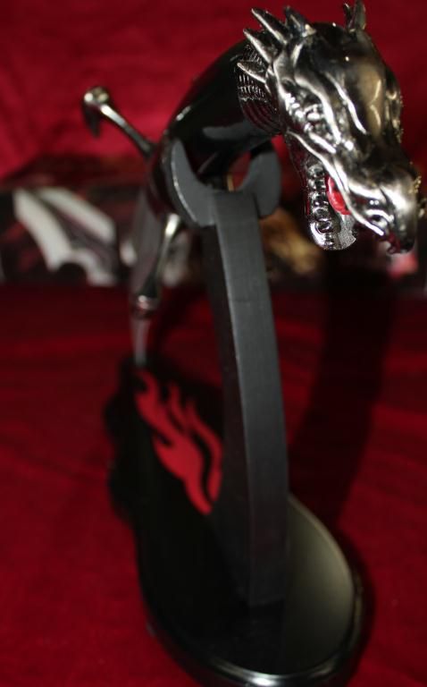 Fantasy Knife & Display. Overall Length 14.25", 7.75" Blade. Intricate Dragon Pommel W/ 4 Dragon Claws At The Guard W/ Detailed Acid Etching On Blade. Elegant Piano Lacquered Black Handle. Matching Claw Finger