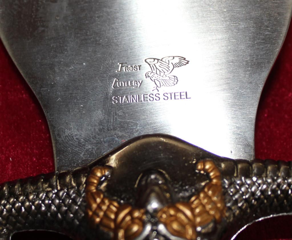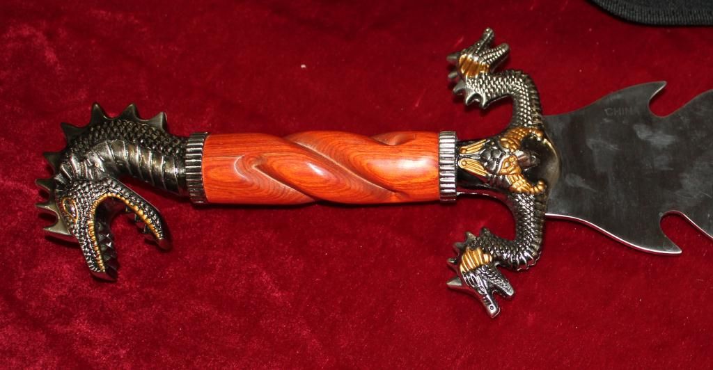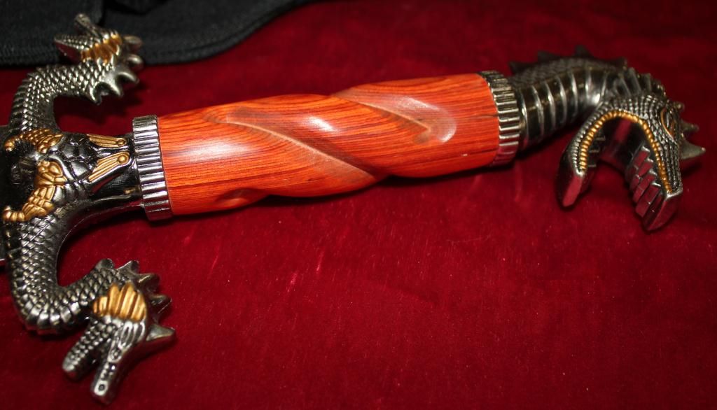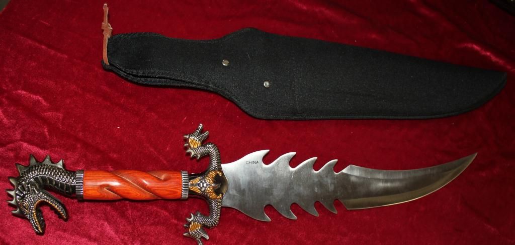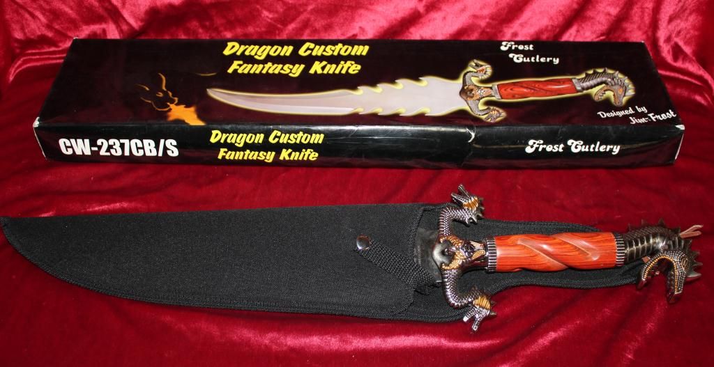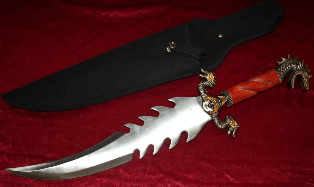 23" Bowie Knife Designed By Jim Frost. Stainless Steel Blade. Cocobolo Wood Handle With Cast Metal Custom Dragon Design Guard & Hilt. Heavy Duty Nylon Sheath.
