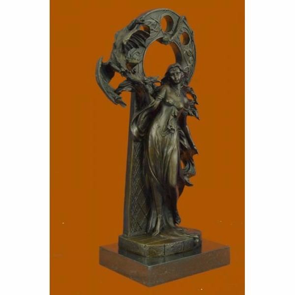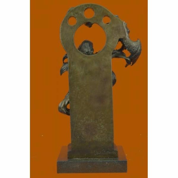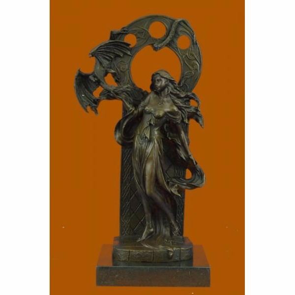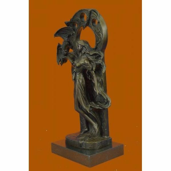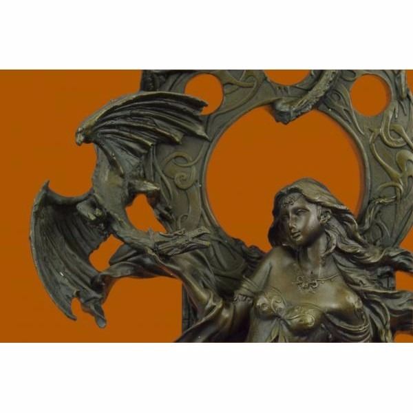 This sculpture is unbelievable in details. This astonishing woman stands on her toe, as a big dragon stand in back of her. She has the most amazing and sexy body for a female, you can see her flat stomach. She is wearing the most distinctive bikini top and like an Indian hand made bottom piece. The Dragon is very large and his mouth and fangs are out as if he is going attack anyone who comes close to the woman, its like her protector. She poses in front of her dragon pet without a care or worry in mind. This sculpture is handmade 100% bronze and is cast using the ancient "Lost Wax Method" in green patina and mounted atop a black marble base, signed by the artist Jean Patoue. Condition : This sculpture is in perfect condition. Bronze Dimensions with Marble Base:Height 16" x Width 8" Marble Dimensions:6.5" X 5" Height without base: 15" Weight : 13 LBS Inventory; 39YRD1321819 3