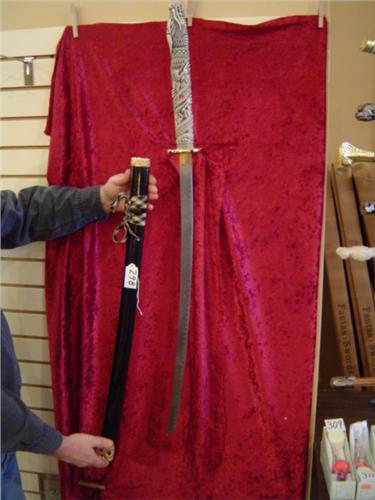 42" Katana. 12" Antiqued Ivory, Stone Resin Handle, Golden Dragon Suba and Saya Hardware, 26" 440 Stainless Katana Blade, ground edge. Black Laquer Saya (Scabbord). For Display Use Only.