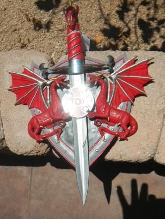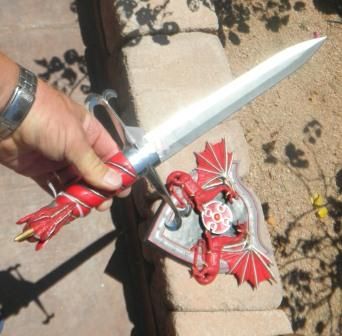 Dragon Plaque with dagger. Blade of the doubled edged stainless steel. Dagger is 17 inches. The entire measures 17x13x2 inches One horn on knife handle is missing