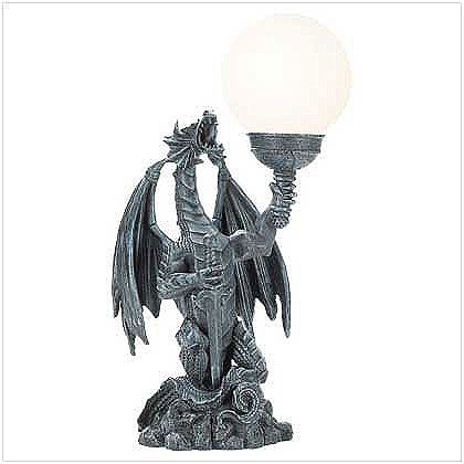 Dragon With Globe Table Lamp **|**|** What an awe-inspiring way to illuminate your castle! Reminiscent of centuries-old European carvings, this roaring dragon holds aloft a glowing glass globe. Pair them on either side of a doorway for a grand entry! Polyresin with glass globe.UL Recognized, 7-watt bulb (not included). 8 1/2 x 7" x 18" high."