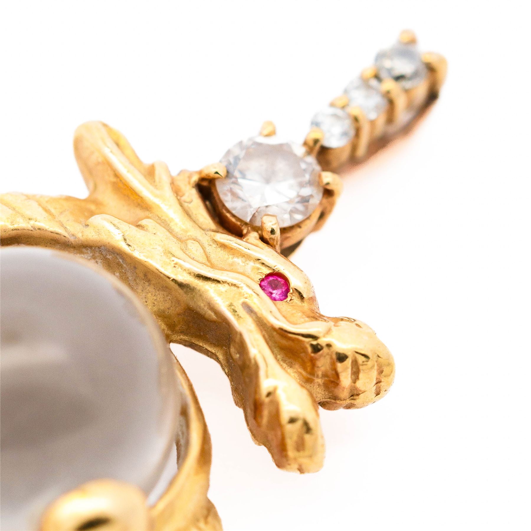 This pendant portrays an Asian dragon coiled protectively around a polished “flaming pearl†cabochon, the mythic beast rendered in finely textured 18K gold and finished with a ruby eye. A diamond pave bail anchored by a larger 0.10 ct diamond adds 0.26 ct of scintillation. A sculptural, late-20th-century piece that combines rich gold work with symbolic Eastern imagery, suitable for a 3-4 mm chain.