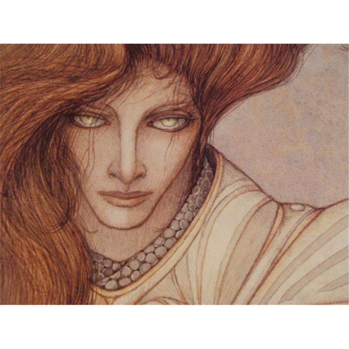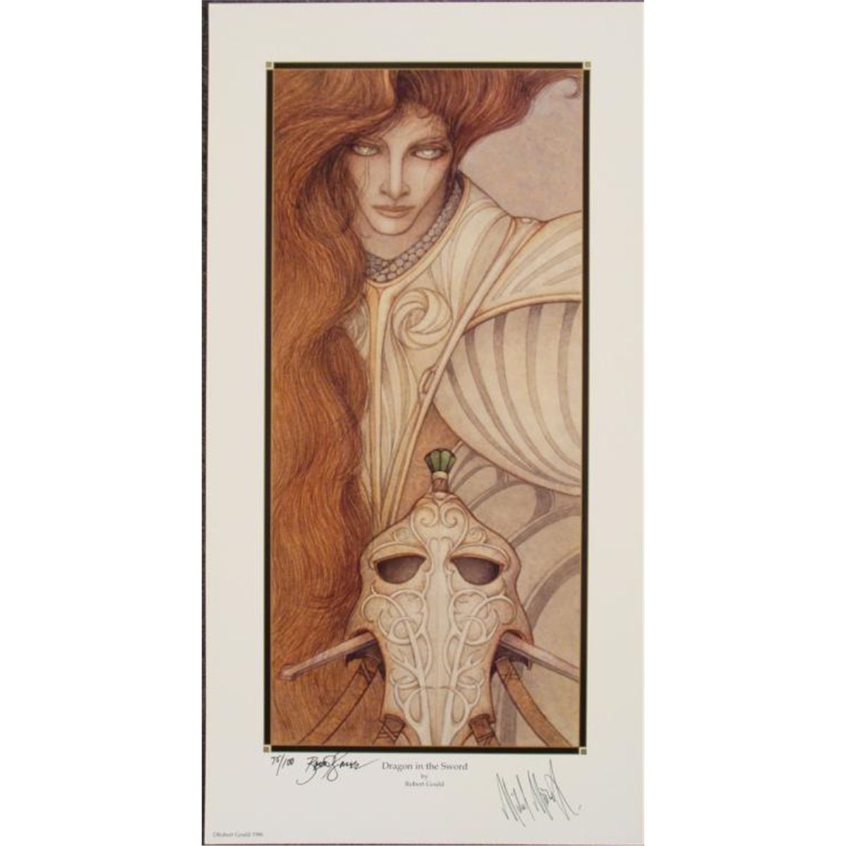 This print portrays a mysterious woman and the dragon in the sword. * Artist: Robert Gould * Signatures: Signed by two people in black marker, lower left and rightTitle: Dragon in the Sword * Medium: Print on paper Edition: Numbered out of 100 * Sheet Size: 13" x 25" Condition: Excellent
