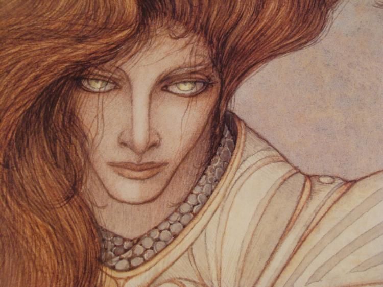 This print portrays a mysterious woman and the dragon in the sword. * Artist: Robert Gould * Signatures: Signed by two people in black marker, lower left and rightTitle: Dragon in the Sword * Medium: Print on paper Edition: Numbered out of 100 * Sheet Size: 13" x 25" Condition: Excellent