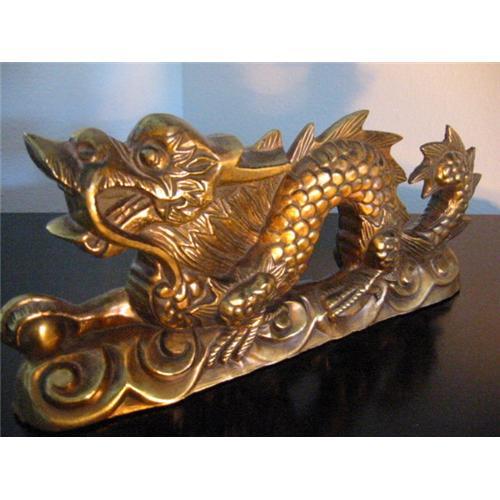This 7 inch metal golden Dragon is stunning and is detailed. It is 15.5 inch wide, with 2 inch deep. It is quite heavy, and base is covered with dark brown felt.The maker is unidetifiable and the workmanship is remarkable. It is in excellent condition, vintage imperfection.