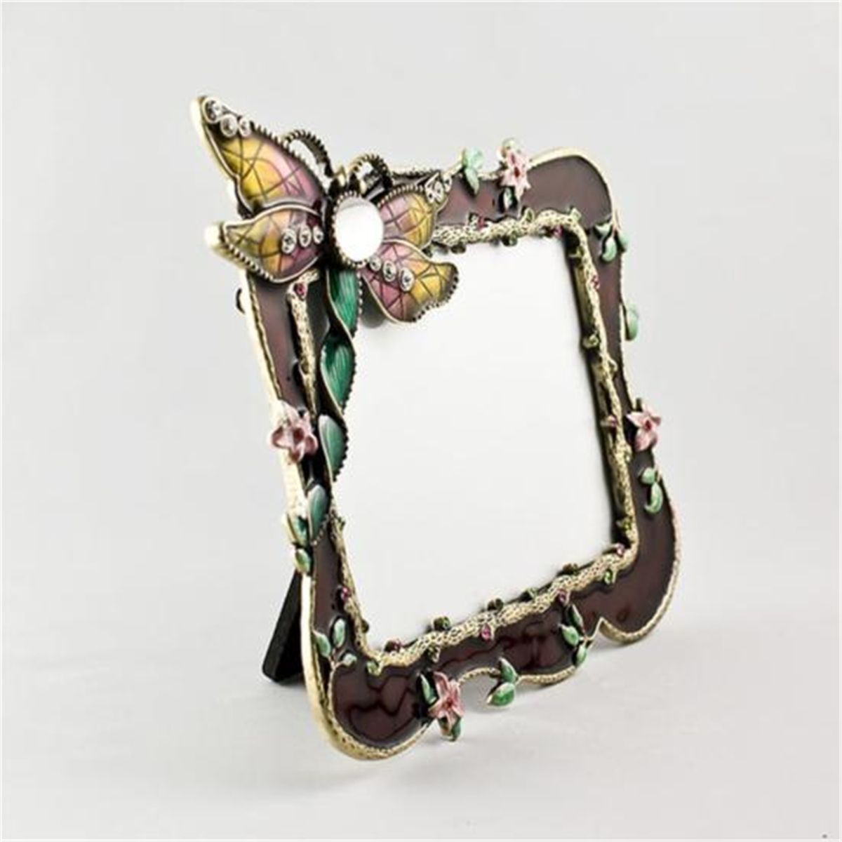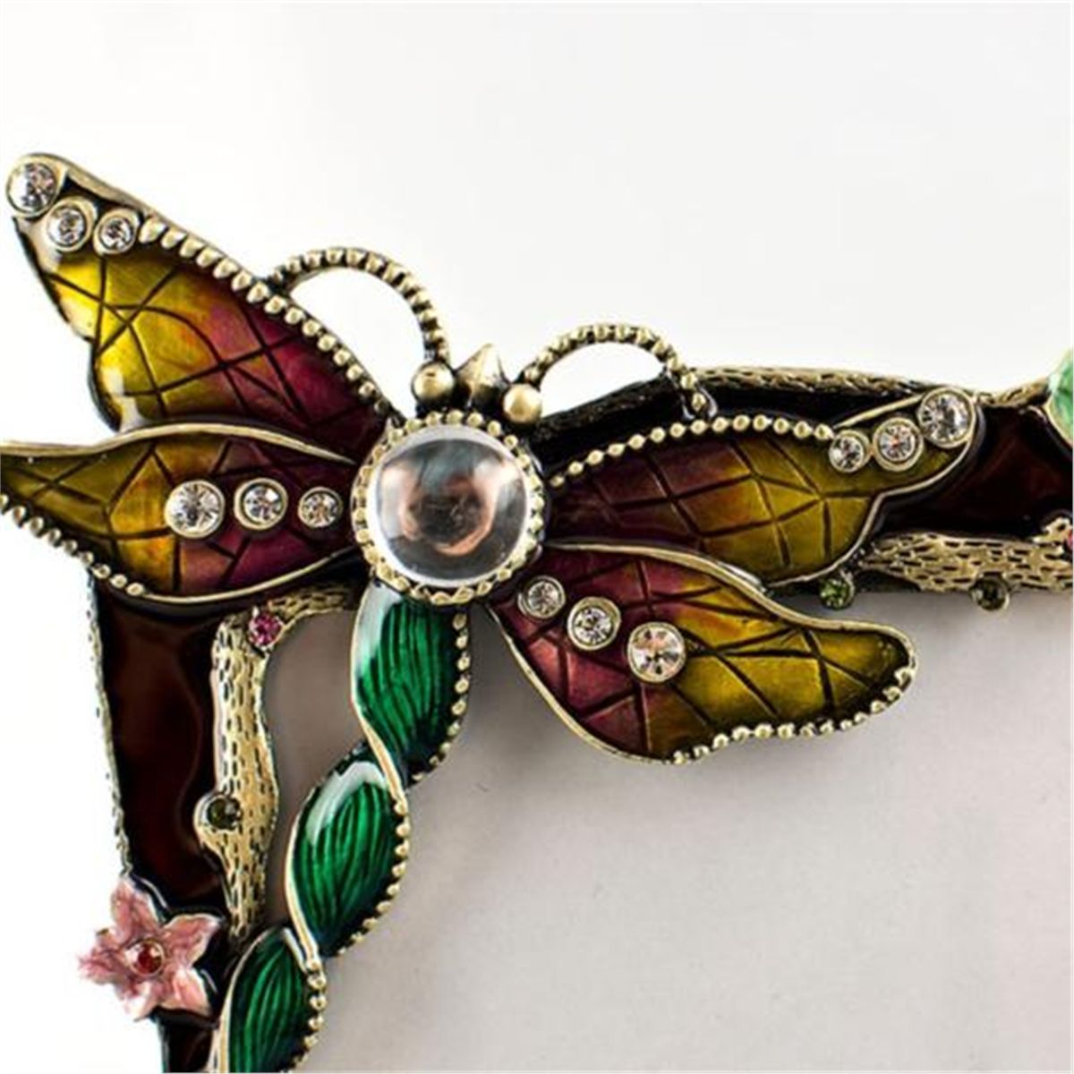 Dragonfly Faberge Frame, The three dimensional Dragonfly sits on the top left corner of the faberge photo frame. A large crystal forms the Dragonflys back, and sets of 3 miniature crystals ornament each of its wings. The frame has pink enameled flowers around it. A golden string with pink and green crystals surrounds the photo slot. Dimensions: 6in (H) X 4.5in (W), Material: Pewter, Enamel, Crystals