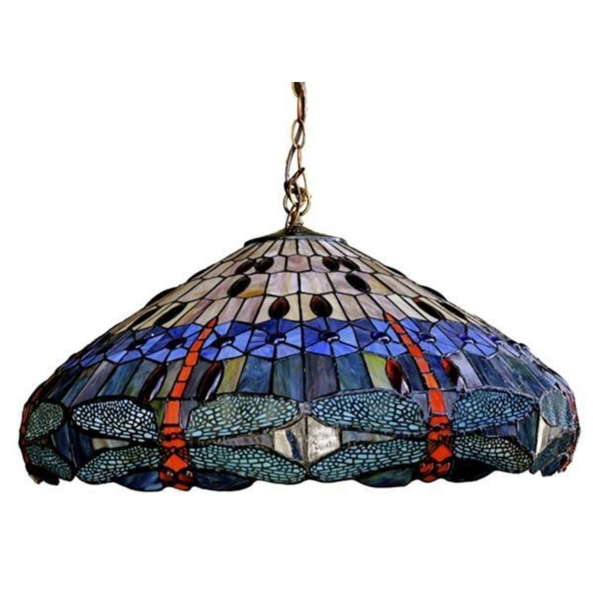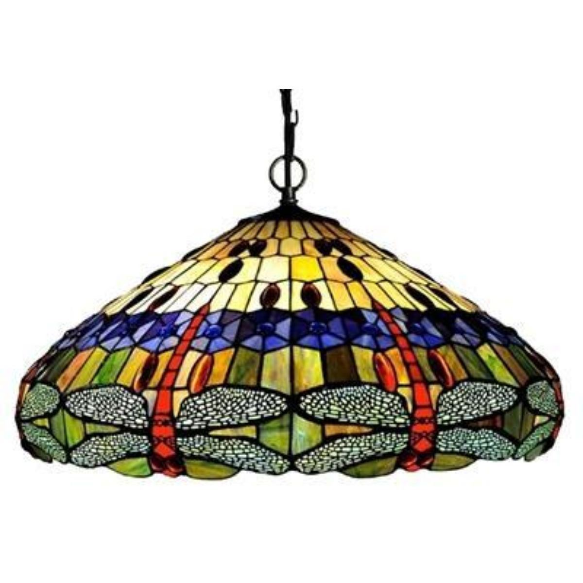 Dragonfly design, Tiffany-style stained art glass, 688 cuts & 96 glass beads, wrapped in copper foil with textured black finish, 3-light hanging pendant light. 24" W X 13" H.Â
