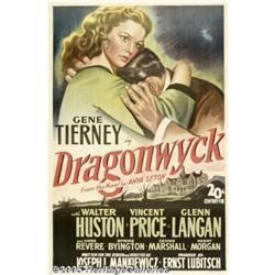 <B>Dragonwyck (20th Century Fox, 1946)</B></I> One Sheet (27" X 41"). Gene Tierney is asked to come live with a wealthy family as a friend and companion to their daughter. The father was played by Vincent Price and we can't help but think Roger Corman must have used this Gothic romance as a inspiration for his use of Price in similar roles in his Edgar Allen Poe series. Joseph Mankiewicz, normally found writing screenplays, was hired to direct the film as well since Ernst Lubitsch suddenly took ill. It's moody and full of mystery and this poster aptly fits the look of the film. The poster has very minor touch up to the folds and the two upper center points. Very Fine+ on Linen.