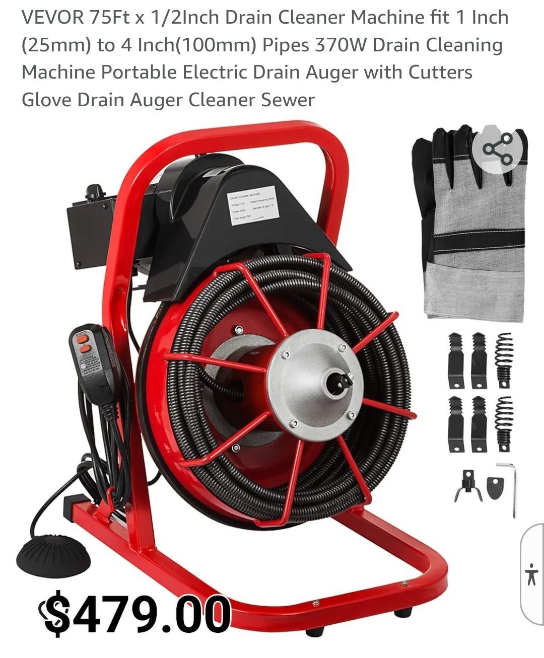 75ft electric drain auger for 1-4 inch pipes, includes gloves and cutting heads, new.