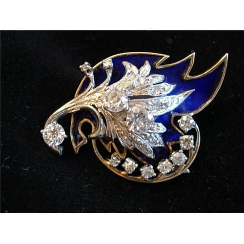 Dramatic Circa 1930 diamond blue enamel platinum and 14kt yellow gold "stylized leaf" brooch - set with three Old European Cut Diamonds .45 - .50 - .70 cts each Near colorless HIJ - SI-I range further accented with 9 Old European Cut and Modern Transitional Cut diamonds total weight ap. .35 cts and further accented with small single cut diamonds all set in platinum with 14kt yellow gold and embellished with blue enamel. Reverse: ball hinge and safety catch. Wonderful piece!!