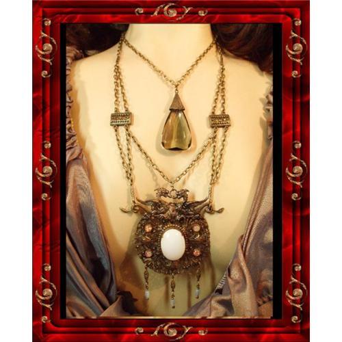 In every respect including size, this is an outrageously glamorous HUGE necklace with dragons breath glass stones and a huge faceted glass topaz color drop that hangs from the swag.( I have more photos if you want to email me) Like a piece you see in the movies where starletts had their luxurious jewels duplicated by all the Czechs, this certainly is fit for the movies or a QUEEN!. The length around the neck is 28? and then you can add an additional 15? drop which had this double dragon holding one of the largest moonstone color glass cabochons I have ever seen. This stone is in the center of fancy filigree with fleur de lis, four dragons breath opal colored stones. This vintage piece is 5? long ( includes the drops) and 4? wide. The most amazing piece that displays so well you will have people coming into your store or booth just to gaze at this spectacular piece. And if you wear it, it is even more dramatic. This is in great condition and even NICER than the photos.