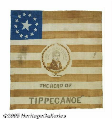 <B>Dramatic Large 1840 William Henry Harrison Campaign Flag</B></I> The 1840 election saw the emergence of the "political flag," a campaign banner in the style of, but usually slightly varying from, an American flag. This was one of the most popular forms of political banner up through the turn of the century. Listed in Collins' <I>Threads of History</B></I> as number 134 (page 102). At 28" x 28", it is one of the largest flags of this genre, and a wonderful display item. Not surprisingly, these fragile textiles tended to survive in "battle-weary" condition. This one was found with some small holes (in total affecting well under one percent of the surface area) and some minor soiling. It has since received a $2,000-plus cleaning, restoration, and mounting against a neutral fabric backing by one of the nation's top conservators of historic textiles (a complete condition report comes to the buyer along with the piece). Present display appearance is excellent, with only a few minor smudge-type marks as seen in catalog photo; it would be hard to find a political flag of this era any nicer. A prize early showpiece! Lot:256