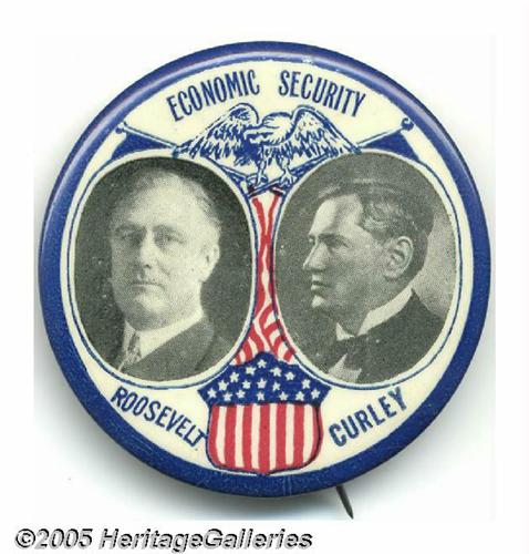 <B>Dramatic Large 2 1/8" 1932 "Coat-tail" Jugate for Franklin D. Roosevelt and Boston's Colorful Mayor James Curley</B></I> The "Economic Security" version of this popular, scarce button. Great shape. Lot:263