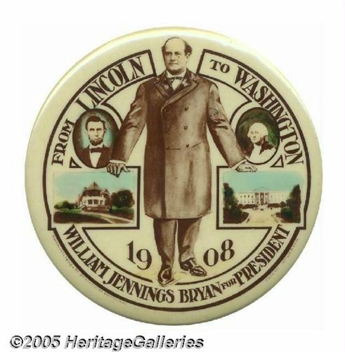 <B>Dramatic Massive 2 1/8" William Jennings Bryan Rarity</B></I> One of the most esteemed button designs of the era, it features color-tinted pictures of Bryan's Lincoln, Nebraska home and the White House. The size and unique design make this a perfect centerpiece for a Bryan collection. Condition is nothing short of spectacular: very choice and perfectly centered. The condition is especially noteworthy because this variety is prone to foxing (as are many larger-size designs of that early era). An unimprovable example! Lot:260