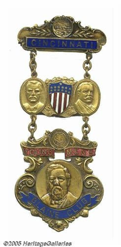 <B>Dramatic William Howard Taft Badge with Teddy Roosevelt and James Blaine</B></I> Heavy, high-quality enamelled brass badge from Cincinnati, Ohio. Since the item hails from Taft's home state, it is a little difficult to attribute: Is this primarily a Taft or a TR item? Usually an item like this dates from the term of the most recent President pictured. But it is also the convention that the image on the left is usually that of the incumbent, in this case Roosevelt. Our guess is that this is a Teddy item, and that, since it was for use in Ohio, it also pictured his well-known protege, Taft, because of his local appeal. As for Blaine's image, this is more easily explained. The 1884 Republican nominee, who had died in 1893, was strangely revered by Republicans at the turn of the century, and there were a number of political clubs named after him throughout the country. A spectacular display item in beautiful condition. Length 5". Lot:261