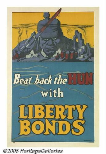 <B>Dramatic World War I Poster</B></I> Nothing typifies the over-the-top propaganda images of World War I posters better than this scarce design, with malevolent "Hun," his bayonet dripping blood! Beautiful condition, nicely custom-framed. 25" x 34" as framed. Lot:254