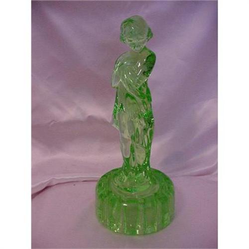 Cambridge "Draped Lady" Green glass figural flower frog, 12-1/2" tall by 5-1/4" dia. Marked with patent number on underside.