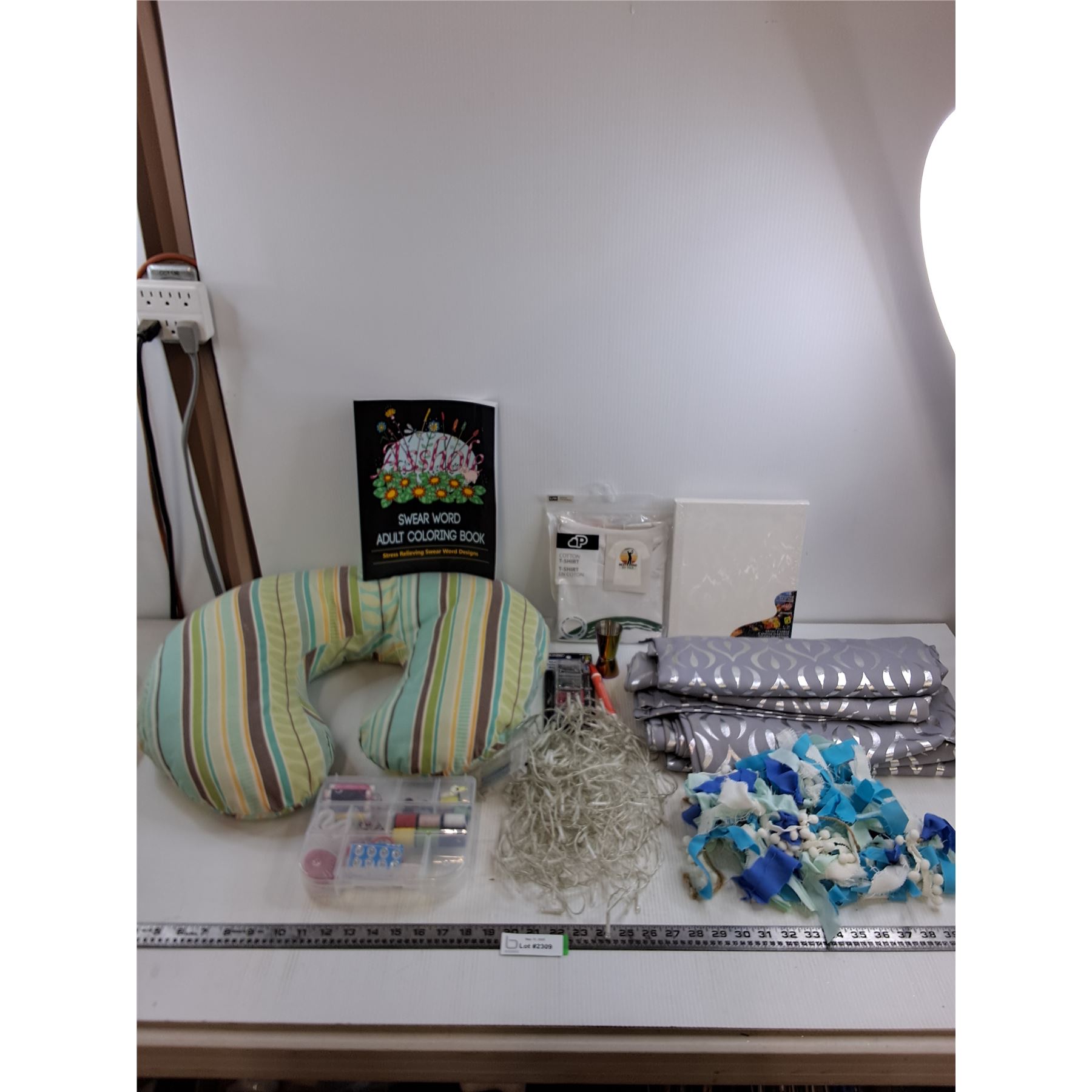 Drapes, Cushion, String Lights, Swear Word Adult Coloring Book, Sewing Kit, Misc.