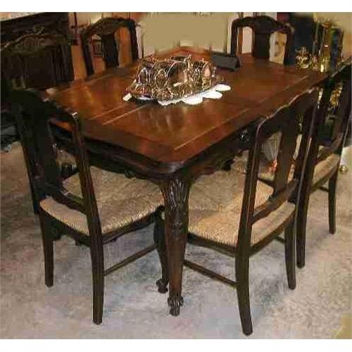 Very handsome and unusual. Original rush in chairs. Table is 85.5 inches extended.