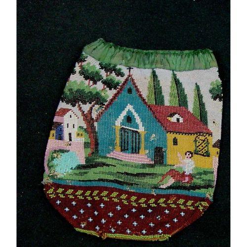 A seated figure is on a lawn outside a church with a cross at the top of the steeple red tile roof with tall green trees in the background, Gothic pattern front doorway with columns, same pattern on the back. 5 1/2" wide by 7" tall. Condition, the draw string is missing and there are maybe 10 spots with 2 to 5 rows of beads with holes missing, but overall, this is an unusual scenic piece and in better condition than you would expect. No visible makers marking in the cloth interior. Easily 1920s or before.