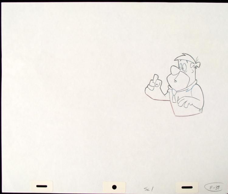 The show is set in the Stone Age town of Bedrock. (In some of the earlier episodes, it was also referred to as "Rockville"). The Flintstones was about a working-class Stone Age man's life with his family and his next-door neighbor and best friend. The show's * continuing popularity rested heavily on its juxtaposition of modern everyday concerns in the Stone Age setting. In this fantasy version of the past, dinosaurs, saber-toothed tigers, woolly mammoths, and other long-extinct animals co-exist with cavemen. Like * their mid-20th century peers, these cavemen listen to records, live in split-level homes, and eat out at restaurants, yet their technology is made entirely from pre-industrial materials and largely powered through the use of various animals. For example, the * cars are made out of stone, wood, and animal skins, and powered by the passengers' feet. * * * Hmmm, I wonder what this does?? * * * * * Original "rough" animation drawing, in non-photo blue and black pencil with the notations in black * Overall size is a 12-field drawing that is 10 1/2" × 12 1/2" * Excellent condition * Traditional animation is a multi-step process which includes various types of art techniques. Drawings are a key part of the process, in which the animator creates the design and movement of the characters. Drawings are then transferred onto acetate cels * (by hand-inking and/or photo copying) to create a production cel, which is then hand painted on the back side, using paint colors chosen and approved by the creator of the series. * * * The cel received by the winning bidder might be ever so slightly different from that in the auction photo. * * * * * The drawing is ready to be matted and framed. The animator's notations are shown at the bottom of the drawing. * *