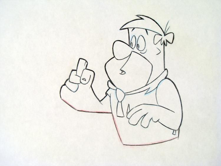 The show is set in the Stone Age town of Bedrock. (In some of the earlier episodes, it was also referred to as "Rockville"). The Flintstones was about a working-class Stone Age man's life with his family and his next-door neighbor and best friend. The show's * continuing popularity rested heavily on its juxtaposition of modern everyday concerns in the Stone Age setting. In this fantasy version of the past, dinosaurs, saber-toothed tigers, woolly mammoths, and other long-extinct animals co-exist with cavemen. Like * their mid-20th century peers, these cavemen listen to records, live in split-level homes, and eat out at restaurants, yet their technology is made entirely from pre-industrial materials and largely powered through the use of various animals. For example, the * cars are made out of stone, wood, and animal skins, and powered by the passengers' feet. * * * Hmmm, I wonder what this does?? * * * * * Original "rough" animation drawing, in non-photo blue and black pencil with the notations in black * Overall size is a 12-field drawing that is 10 1/2" × 12 1/2" * Excellent condition * Traditional animation is a multi-step process which includes various types of art techniques. Drawings are a key part of the process, in which the animator creates the design and movement of the characters. Drawings are then transferred onto acetate cels * (by hand-inking and/or photo copying) to create a production cel, which is then hand painted on the back side, using paint colors chosen and approved by the creator of the series. * * * The cel received by the winning bidder might be ever so slightly different from that in the auction photo. * * * * * The drawing is ready to be matted and framed. The animator's notations are shown at the bottom of the drawing. * *