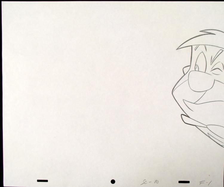 The show is set in the Stone Age town of Bedrock. (In some of the earlier episodes, it was also referred to as "Rockville"). The Flintstones was about a working-class Stone Age man's life with his family and his next-door neighbor and best friend. The show's * continuing popularity rested heavily on its juxtaposition of modern everyday concerns in the Stone Age setting. In this fantasy version of the past, dinosaurs, saber-toothed tigers, woolly mammoths, and other long-extinct animals co-exist with cavemen. Like * their mid-20th century peers, these cavemen listen to records, live in split-level homes, and eat out at restaurants, yet their technology is made entirely from pre-industrial materials and largely powered through the use of various animals. For example, the * cars are made out of stone, wood, and animal skins, and powered by the passengers' feet. * * * I have my eye on you, no funny business, you hear!! * * * * * Original "rough" animation drawing, in black pencil with the notations in black * Overall size is a 12-field drawing that is 10 1/2" × 12 1/2" * Excellent condition * Traditional animation is a multi-step process which includes various types of art techniques. Drawings are a key part of the process, in which the animator creates the design and movement of the characters. Drawings are then transferred onto acetate cels * (by hand-inking and/or photo copying) to create a production cel, which is then hand painted on the back side, using paint colors chosen and approved by the creator of the series. * * * The drawing is ready to be matted and framed. The animator's notations are shown at the bottom of the drawing. * *