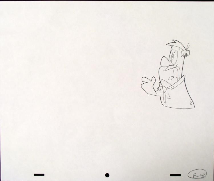 The show is set in the Stone Age town of Bedrock. (In some of the earlier episodes, it was also referred to as "Rockville"). The Flintstones was about a working-class Stone Age man's life with his family and his next-door neighbor and best friend. The show's * continuing popularity rested heavily on its juxtaposition of modern everyday concerns in the Stone Age setting. In this fantasy version of the past, dinosaurs, saber-toothed tigers, woolly mammoths, and other long-extinct animals co-exist with cavemen. Like * their mid-20th century peers, these cavemen listen to records, live in split-level homes, and eat out at restaurants, yet their technology is made entirely from pre-industrial materials and largely powered through the use of various animals. For example, the * cars are made out of stone, wood, and animal skins, and powered by the passengers' feet. * * * NOOOOOO, this can't be happening!! * * * * * Original "rough" animation drawing, in black pencil with the notations in black * Overall size is a 12-field drawing that is 10 1/2" × 12 1/2" * Excellent condition * Traditional animation is a multi-step process which includes various types of art techniques. Drawings are a key part of the process, in which the animator creates the design and movement of the characters. Drawings are then transferred onto acetate cels * (by hand-inking and/or photo copying) to create a production cel, which is then hand painted on the back side, using paint colors chosen and approved by the creator of the series. * * * The drawing is ready to be matted and framed. The animator's notations are shown at the bottom of the drawing. * *