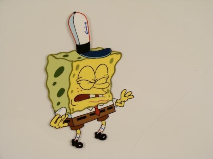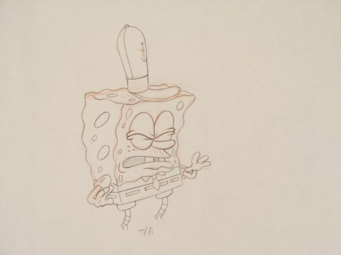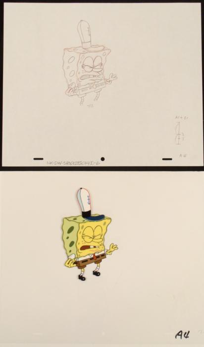 This original animation cel and drawing are from the Nickelodeon TV show SpongeBob Squarepants. The story takes place under the deep blue sea in Bikini Bottom, where SpongeBob resides. SpongeBob, who is a yellow, porous sponge, is your typical happy-go-lucky character, as he is always cheerful and enjoys making people laugh. Patrick Star, SpongeBob's neighbor who is a starfish, is your average children's show idiot, as he boasts knowing nothing and is often getting himself into ridiculous situations. Between the homes of these two lies the home of the miserable Squidward, a squid, who is known for being grouchy and playing tricks on SpongeBob and Patrick. Both SpongeBob and Squidward work at the Krusty Krab, a fast food business run by the greedy money-loving Mr. Krabs, a crab, the arch rival of the evil, possibly misunderstood, Plankton. Another neighbor, Sandy Cheeks, an athletic squirrel who normally wears an astronaut's space suit, was introduced in "Tea at the Treedome." She spends most of her time inventing and experimenting. SpongeBob has his eyes shut.Original Production Animated Cel and Drawing Original "rough" animation drawing, in black and red pencil, with notations in black. Overall Size of Drawing: 10 1/2" x 12 1/2" Overall Size of Cel: 10 1/2" x 12 1/2" Excellent ConditionThis is an original hand-painted cel set-up used in the production of an episode of "SpongeBob SquarePants." Each one-of-a-kind set-up represents a slight change in position of the characters. When individually photographed and projected in rapid succession, the images appear to move.