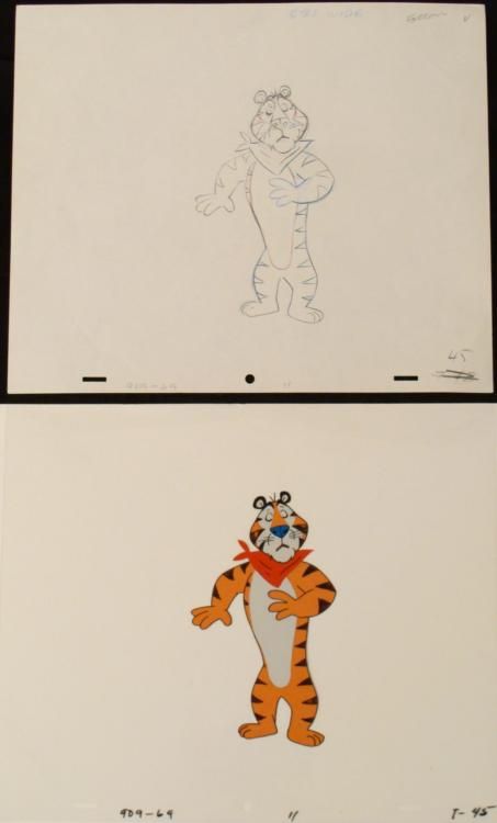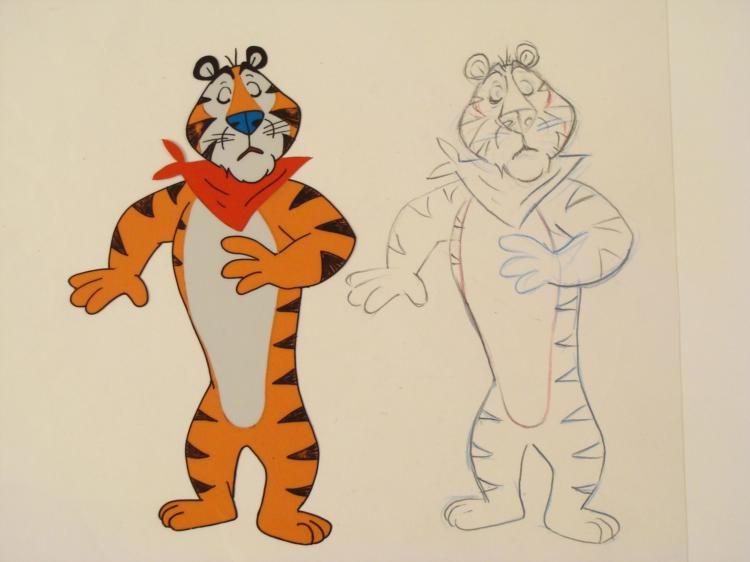 My lips are sealed... You never find out the secret recipe to my mouth watering cereal... * * * Original Drawing and Animated Cel Original "rough" animation drawing, in non-photo blue, black, and red with the notations in non-photo blue and black * * Overall size is a 12-field drawing that is 10 1/2" × 12 1/2" * Overall Size of the Cels: 10 1/2" x 12 1/2" * Excellent Condition * * * This is an original hand-painted cel set-up used in the production of the "Frosted Flakes Commercial." Each one-of-a-kind set-up represents a slight change in position of the characters. When * individually photographed and projected in rapid succession, the images appear to move. * * To create production cels, the original animator's drawing is transferred onto an acetate cel (by hand-inking and/or photo copying). * * * * * The cel and drawing are ready to be matted and framed. The animator's notations are at the bottom of the cel and the top and bottom of the drawing. * * *