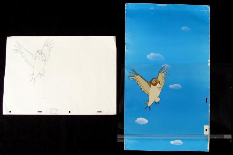 Christopher Robin and his boy animals, have one adventure after another —everything from filching honey from the angry bees to welcoming Tigger (a very bouncy animal), consoling Eeyore (the gloomy donkey), enduring * a flood, and seeking out the South Pole. Everything is related in extremely childish (but by no means "cutesy" terms), including bursts of poetry, rudimentary logic, and a great deal of remarkably in-depth character study. Each animal has a district personality: * impulsive Tigger, neurotic Eeyore, no-nonsense Kanga, self-important Rabbit and Owl, humble Piglet, and, of course, direct and simple Pooh. The animals might be any group of typical siblings or playmates and teach, through their adventures, many real life * lessons. * * * * I can fly, I can fly... * * * * Original Production Animated Ce, Drawing, and Background * Overall Size of Cel: 10 1/2" x 12 1/2" Overall Size of Background: 11 x 19 1/2"Original "rough" animation drawing, in non-photo blue and black pencil, with notations in black and non-photo blue. * * * Overall Size of Drawing: 10 1/2" x 12 1/2"Overall Condition: Cel and Drawing- Excellent and Background- Good * * * This is an original hand-painted cel was used in the production of an episode of "SpongeBob SquarePants." Each one-of-a-kind cel * represents a slight change in position of the characters. When individually photographed and projected in rapid succession, the images appear to move. * * To create production cels, the original animator's drawing is transferred onto an acetate cel (by hand-inking and/or photo copying). The cel is then hand-painted on the reverse side. The cel received by the winning bidder may be ever so slightly different * from the one in the auction photos. The background accompanying this set-up is a hand-painted original production background. * * * The cel is ready to be matted and framed. The animator's notations are at the bottom of the cel and drawing and the top of the background. The edges of the background has small rips and has creases. The animators notations have been taped onto the bottom * of the cel. * * *