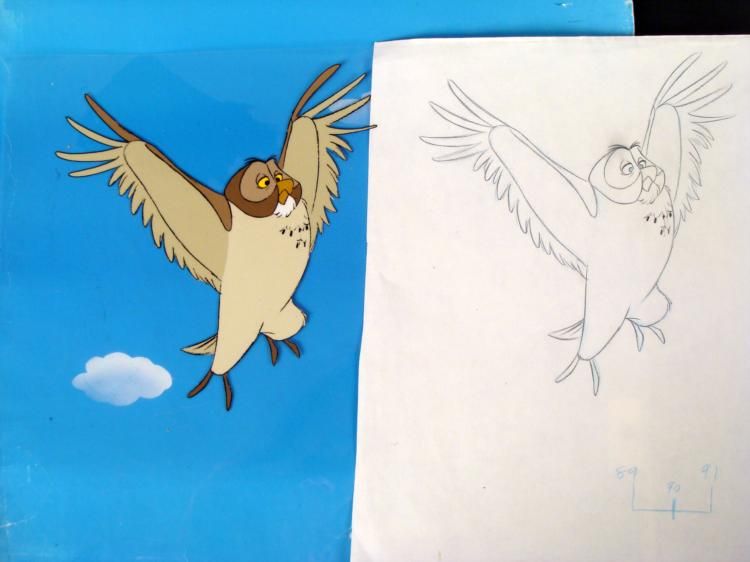 Christopher Robin and his boy animals, have one adventure after another —everything from filching honey from the angry bees to welcoming Tigger (a very bouncy animal), consoling Eeyore (the gloomy donkey), enduring * a flood, and seeking out the South Pole. Everything is related in extremely childish (but by no means "cutesy" terms), including bursts of poetry, rudimentary logic, and a great deal of remarkably in-depth character study. Each animal has a district personality: * impulsive Tigger, neurotic Eeyore, no-nonsense Kanga, self-important Rabbit and Owl, humble Piglet, and, of course, direct and simple Pooh. The animals might be any group of typical siblings or playmates and teach, through their adventures, many real life * lessons. * * * * I can fly, I can fly... * * * * Original Production Animated Ce, Drawing, and Background * Overall Size of Cel: 10 1/2" x 12 1/2" Overall Size of Background: 11 x 19 1/2"Original "rough" animation drawing, in non-photo blue and black pencil, with notations in black and non-photo blue. * * * Overall Size of Drawing: 10 1/2" x 12 1/2"Overall Condition: Cel and Drawing- Excellent and Background- Good * * * This is an original hand-painted cel was used in the production of an episode of "SpongeBob SquarePants." Each one-of-a-kind cel * represents a slight change in position of the characters. When individually photographed and projected in rapid succession, the images appear to move. * * To create production cels, the original animator's drawing is transferred onto an acetate cel (by hand-inking and/or photo copying). The cel is then hand-painted on the reverse side. The cel received by the winning bidder may be ever so slightly different * from the one in the auction photos. The background accompanying this set-up is a hand-painted original production background. * * * The cel is ready to be matted and framed. The animator's notations are at the bottom of the cel and drawing and the top of the background. The edges of the background has small rips and has creases. The animators notations have been taped onto the bottom * of the cel. * * *