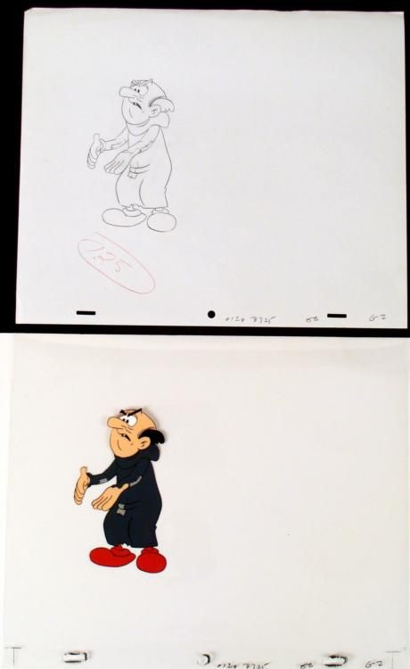 Classic Saturday-morning cartoon series featuring magical blue elf-like creatures called Smurfs. The Smurfs, named for their personalities, inhabit a village of mushroom houses in an enchanted forest. These loveable creatures are led by Papa Smurf and * live carefree... except for one major threat to their existance: Gargamel, an evil but inept wizard who lives in a stone-built house in the forest; and his feline companion, the equally nasty Azrael. Typical stories deal with the Smurfs' efforts to fight off * Gargamel, who wanted to do one of several things to the blue creatures including eat them, make them slaves and gain their magical secrets in order to gain dignity among the wizard's fraternity. More than once, the Smurfs had to save Gargamel from his back-firing * plans or even eviler wizard * * * * Oh come on, give me a break!! There is a matching drawing overlay of Gargamel that accompanies the cel. * * * Original Animated Cel and DrawingOriginal "rough" animation drawing, in black pencil with the notations in black and red pencil * Overall size is a 12-field drawing that is 10 1/2" × 12 1/2" * Overall Size of Cel: 10 1/2" x 12 1/2" * * Excellent Condition * * * This is an original hand-painted cel set-up used in an episode of "The Smurfs." Each one-of-a-kind cel represents a slight change in position of the characters. When individually photographed and projected in rapid succession, the images appear to move. * * To create production cels, the original animator's drawing is transferred onto an acetate cel (by hand-inking and/or photo copying). The cel is then hand-painted on the reverse side. * * * The cel and drawing are ready to be matted and framed. The animator's notations are shown at the bottom of both. * *