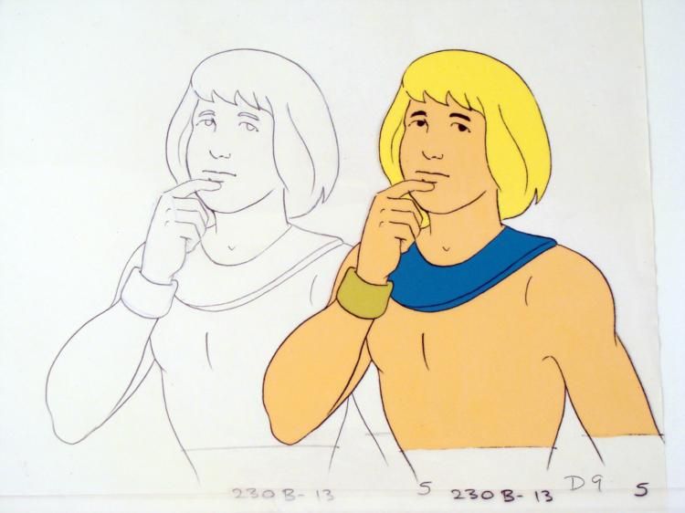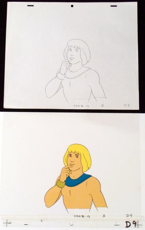 The Herculoids battled to defend their planet from menaces on Amzot/Quasar and from outer space. All of the Herculoids displayed Human-level intelligence - employing precision teamwork and complex tactics - as well as emotions, and Zandor and Tara both * displayed a working knowledge of complex alien technologies as well as the ability to pilot interstellar spacecraft—but essentially, Zandor, Tara, Dorno, and the Herculoids were fighting to keep Amzot/Quasar a technology-free, primitive planet. This is further * indicated by the pseudo-barbarian outfits of Zandor, Tara, and Dorno and the fact that technology was used mainly by the various villains, but rarely if ever by the heroes. Although the "speech" of their companions was limited and repetitive, Zandor, Tara * and Dorno demonstrated that Gloop and Gleep, at least, had a comprehensive mode of communication, and that they could at least understand and interpret this language. * * * * **The cel and drawing are at least 35 years old. * * * * I wonder what Dorno is thinking about... * * * Original Animation and Drawing * * Original "rough" animation drawing, in black and non-photo blue pencil with the notations in black. * * * Overall Size of Drawing: 10 1/2" x 12 1/2" * Overall Size of the Cel: 10 1/2" x 12 1/2" * Excellent condition * This is an original hand-painted cel set-up used in the production of an episode of "Herculoids." Each one-of-a-kind set-up represents a slight change in position of the characters. When individually photographed and projected in rapid succession, the images * appear to move. * * To create production cels, the original animator's drawing is transferred onto an acetate cel (by hand-inking and/or photo copying). The cel is then hand-painted on the reverse side. * * The cel and drawing received by the winning bidder may be ever so slightly different from that in the auction photos. * * * * The drawing and cel are ready to be matted and framed. The notations are located at the bottom of the drawing and cel. Some of the notations are taped to the bottom of the cel. *
