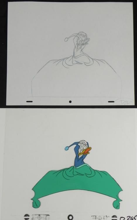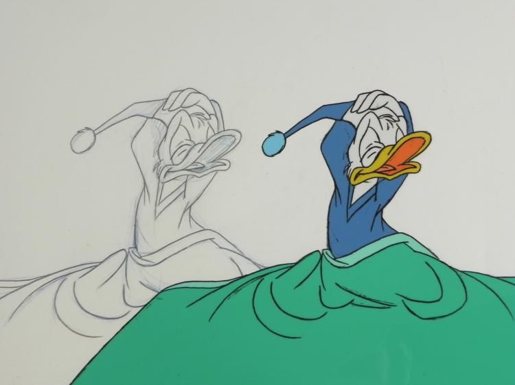 Donald Fauntleroy Duck is a cartoon character created in 1934 at Walt * Disney Productions. Donald is an anthropomorphic white duck with a * yellow-orange bill, legs, and feet. He typically wears a sailor suit * with a cap and a black or red bow tie. Donald * is most famous for his semi-intelligible speech and his mischievous and * irritable personality. Along with his friend Mickey Mouse, Donald is * one of the most popular Disney characters and was included in TV Guide's * list of the 50 greatest cartoon characters * of all time in 2002. * * This needs to stop... * Original Animation Cel and * DrawingOriginal "rough" drawing in black and * non-photo blue pencil with the notations in non-photo * blueOverall size is a 12-field drawing that is 10 * 1/2" x 12 1/2"Size of cel: 10 1/2" x 12 * 1/2"Overall condition: * Excellent * This is * an original hand-painted cel used in * the production of an episode of "Donald Duck." Each cel represents a * slight change in position of the characters. When individually * photographed and projected in rapid succession, the images * appear to move. To * create production cels, the original animator's drawing is transferred * onto an acetate cel (by hand-inking and/or photo copying). The cel is * then hand-painted on the reverse side. * * * * The drawing and cel are ready to be matted and * framed. The notations are located at the bottom of * both.