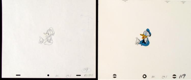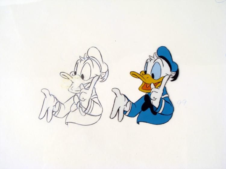 Donald Duck is a cartoon character created in 1934 at Walt Disney Productions. Donald is an anthropomorphic white duck with a yellow-orange bill, legs, and feet. He typically wears a sailor suit with a cap and a black or red bow tie. Donald is most famous * for his semi-intelligible speech and his mischievous and irritable personality. Along with his friend Mickey Mouse, Donald is one of the most popular Disney characters and was included in TV Guide's list of the 50 greatest cartoon characters of all time in * 2002. That is a great idea... Why didn't I think of that?? * Original Drawing and Animated Cel Overall Size of Background: 11" x 17" Overall Size of the Cel: 10 1/2" x 12 1/2" Very Good Condition * This is an original hand-painted cel was used in the production of an episode of "Donald Duck." Each cel represents a slight change in position of the characters. When individually photographed and projected in rapid succession, the images appear to move. * To create production cels, the original animator's drawing is transferred onto an acetate cel (by hand-inking and/or photo copying). The cel is then hand-painted on the reverse side. * * * The drawing and cel are ready to be matted and framed. The animators notations are located at the bottom of the cel and at top and bottom of the drawing. Part of Donald's beak appears to been removed with tape.