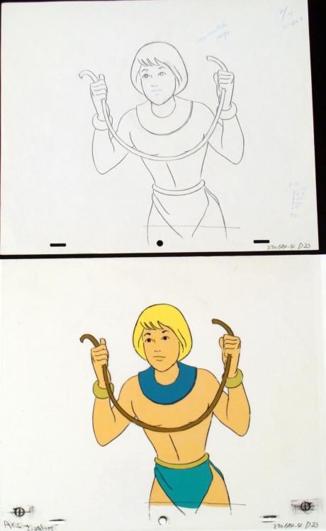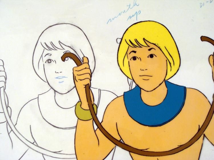 The Herculoids battled to defend their planet from menaces on Amzot/Quasar and from outer space. All of the Herculoids displayed Human-level intelligence - employing precision teamwork and complex tactics - as well as emotions, and Zandor and Tara both * displayed a working knowledge of complex alien technologies as well as the ability to pilot interstellar spacecraft—but essentially, Zandor, Tara, Dorno, and the Herculoids were fighting to keep Amzot/Quasar a technology-free, primitive planet. This is further * indicated by the pseudo-barbarian outfits of Zandor, Tara, and Dorno and the fact that technology was used mainly by the various villains, but rarely if ever by the heroes. Although the "speech" of their companions was limited and repetitive, Zandor, Tara * and Dorno demonstrated that Gloop and Gleep, at least, had a comprehensive mode of communication, and that they could at least understand and interpret this language. **The cel and drawing are at least 35 years old. Wait, how did Zandor make that slip-knot * again?? <ul type="disc"> * Original Animation and Drawing Original "rough" animation drawing, in black and non-photo blue pencil with the notations in non-photo blue and black. * Overall Size of Drawing: 10 1/2" x 12 1/2" Overall Size of the Cel: 10 1/2" x 12 1/2" Very good condition- slight paint fade to Dorno's outline * This is an original hand-painted cel used in the production of an episode of "Herculoids." Each cel represents a slight change in position of the characters. When individually photographed and projected in rapid succession, the images appear to move. To * create production cels, the original animator's drawing is transferred onto an acetate cel (by hand-inking and/or photo copying). The cel is then hand-painted on the reverse side. * * * The drawing and cel are ready to be matted and framed. The notations are located at the top and the bottom of the drawing and at the bottom of the cel.