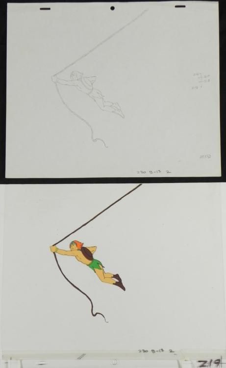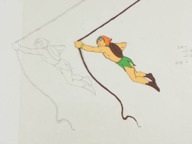 The Herculoids battled to defend their planet from menaces on * Amzot/Quasar and from outer space. All of the Herculoids displayed * Human-level intelligence - employing precision teamwork and complex * tactics - as well as emotions, and Zandor and Tara both * displayed a working knowledge of complex alien technologies as well as * the ability to pilot interstellar spacecraft—but essentially, Zandor, * Tara, Dorno, and the Herculoids were fighting to keep Amzot/Quasar a * technology-free, primitive planet. This is further * indicated by the pseudo-barbarian outfits of Zandor, Tara, and Dorno * and the fact that technology was used mainly by the various villains, * but rarely if ever by the heroes. Although the "speech" of their * companions was limited and repetitive, Zandor, Tara * and Dorno demonstrated that Gloop and Gleep, at least, had a * comprehensive mode of communication, and that they could at least * understand and interpret this language. * * * * **The cel and drawing are at least 35 years old. * * * * WATCH OUT!!! I'm coming in hot... * * * Original Animation * and Drawing * * Original * "rough" animation drawing, in black and non-photo blue pencil with the * notations in black. * * * Overall * Size of Drawing: 10 1/2" x 12 1/2" * Overall * Size of the Cel: 10 1/2" x 12 1/2" * Excellent * condition * This is an original hand-painted cel set-up * used in the production of an episode of "Herculoids." Each one-of-a-kind * set-up represents a slight change in position of the characters. When * individually photographed and projected in rapid succession, * the images * appear to move. * * To create production cels, the original animator's drawing is * transferred onto an acetate cel (by hand-inking and/or photo copying). * The cel is then hand-painted on the reverse side. * * * The drawing and cel are ready to be matted and * framed. The notations are located at the bottom of * the drawing and cel. *