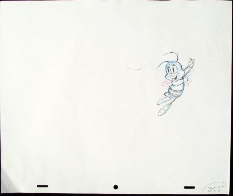 Commercials for Cheerios have been a mainstay of Saturday morning cartoon programming for many years. They generally depict the mascot tempting a hapless child or adult with a sparkling bowl of Honey Nut Cheerios, and their attempts to compete for it. * This is an original animation drawing from the production of the Cheerios commercial. * * And just like that, a bowl of my favorite Cheerio's cereal... Am I good or what? * * * Original "rough" animation drawing in black, non-photo blue, and red pencil with the notations in blackCel size: 10 1/2 x 12 1/2 inchesCondition: Very good; creased lower left cornerTraditional animation is a multi-step process which includes various types of art techniques. Drawings are a key part of the process, in which the animator creates the design and movement of the characters. * Drawings are then transferred onto acetate cels (by hand-inking and/or photo copying) to create a production cel, which is then hand painted on the back side, using paint colors chosen and approved by the creator of the series. The drawing is ready to be matted and framed.