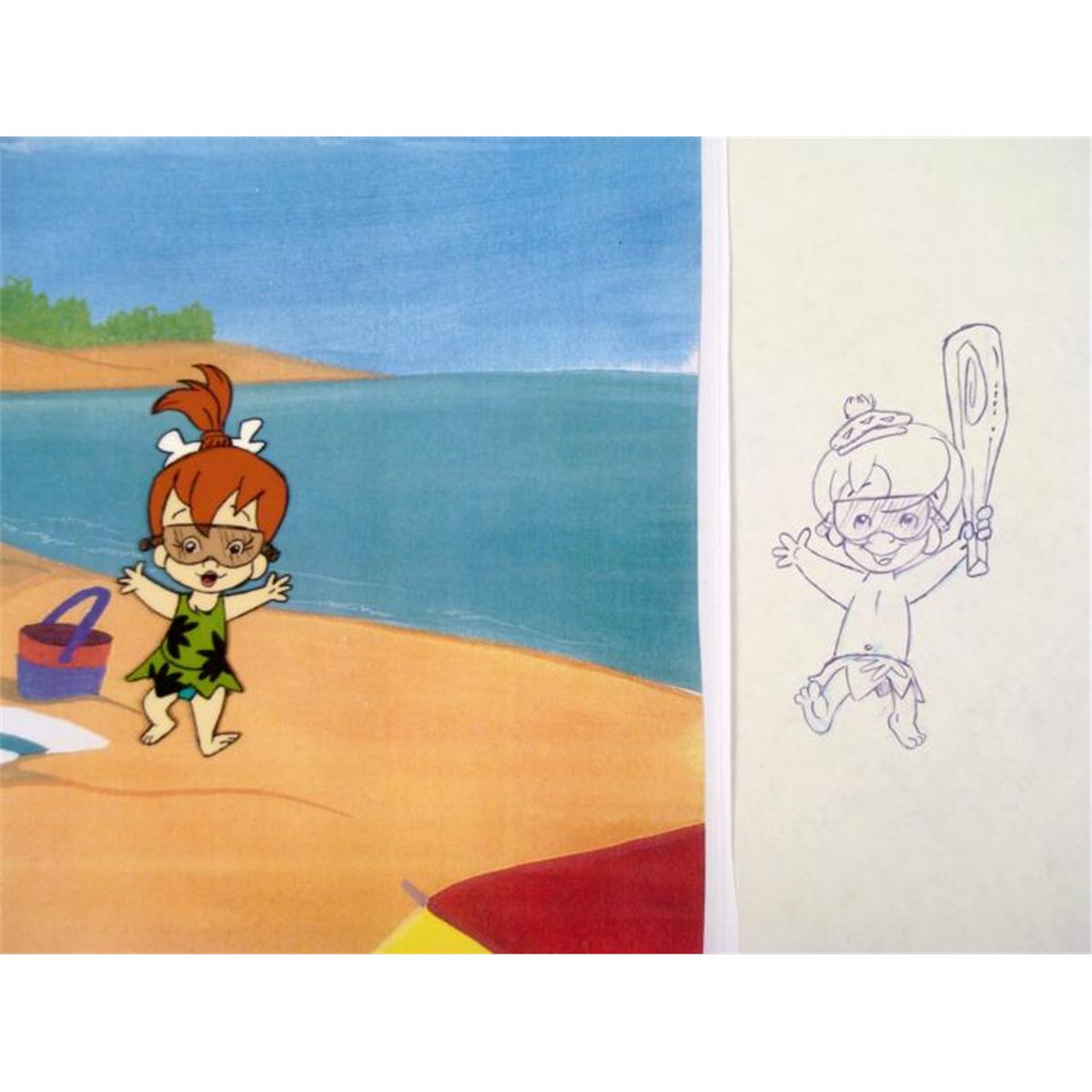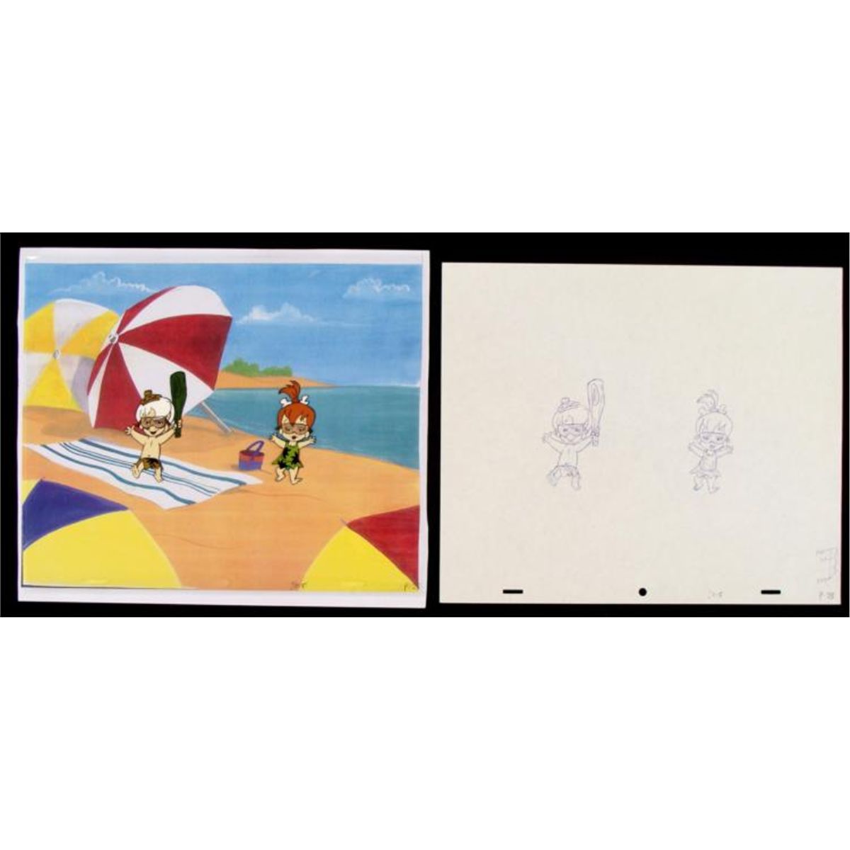 Wouldn't it be nice to be young again? You can play all day and have little responsibilities, like Pebbles and Bam Bam. The cel comes with a matching drawing overlay. * * Original Production Art Cel, Drawing, and Reproduction Background Original "rough" animation drawing, with notations in black. Bam Bam and Pebbles have been outlined in purple and parts of their body in non-photo blue. * Overall Size of the Cel: 10 1/2" x 12 1/2" Overall Size of Reproduction Background: 11" x 13 1/4" * Excellent condition This is an original hand-painted cel set-up used in the production of an episode of "The Flintstones." Each one-of-a-kind set-up represents a slight change in position of the characters. When individually photographed and projected in rapid succession, the images appear to move. * To create production cels, the original animator's drawing is transferred onto an acetate cel (by hand-inking and/or photo copying). The cel is then hand-painted on the reverse side. The background accompanying this set-up is a reproduction background. * * The cel, drawing, and background are ready to be matted and framed. The animator's notations are shown at the bottom of the cel and drawing. *