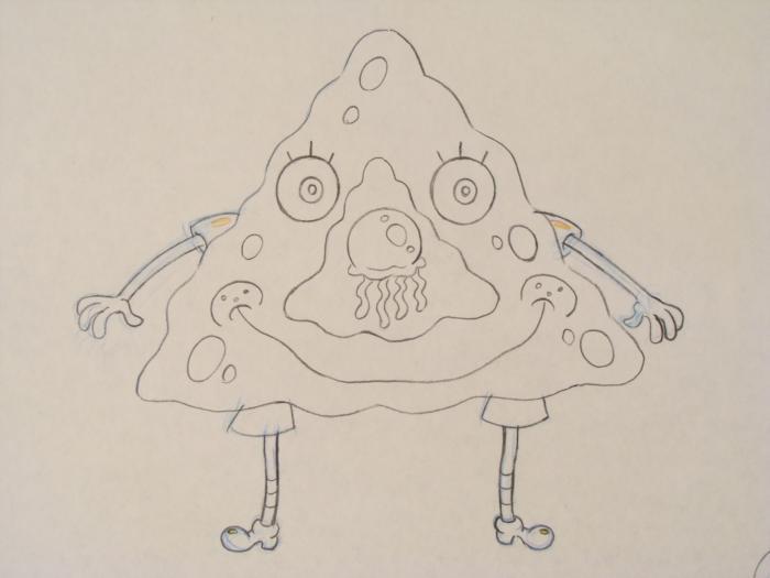 This original animation cel is from the Nickelodeon TV show SpongeBob Squarepants. The story takes place under the deep blue sea in Bikini Bottom, where SpongeBob resides. SpongeBob, who is a yellow, porous sponge, is your typical happy-go-lucky character, as he is always cheerful and enjoys making people laugh. Patrick Star, SpongeBob's neighbor who is a starfish, is your average children's show idiot, as he boasts knowing nothing and is often getting himself into ridiculous situations. Between the homes of these two lies the home of the miserable Squidward, a squid, who is known for being grouchy and playing tricks on SpongeBob and Patrick. Both SpongeBob and Squidward work at the Krusty Krab, a fast food business run by the greedy money-loving Mr. Krabs, a crab, the arch rival of the evil, possibly misunderstood, Plankton. Another neighbor, Sandy Cheeks, an athletic squirrel who normally wears an astronaut's space suit, was introduced in "Tea at the Treedome." She spends most of her time inventing and experimenting. Check out Spongebob's new look. The cel comes with a matching drawing overlay. Original Production Animated Cel and Drawing Original "rough" animation drawing, in black and non-photo blue pencil, with notations in black. Overall Size of Drawing: 10 1/2" x 12 1/2" Overall Size of Cel: 10 1/2" x 12 1/2" Excellent ConditionThis is an original hand-painted cel set-up used in the production of an episode of "SpongeBob SquarePants." Each one-of-a-kind set-up represents a slight change in position of the characters. When individually photographed and projected in rapid succession, the images appear to move.