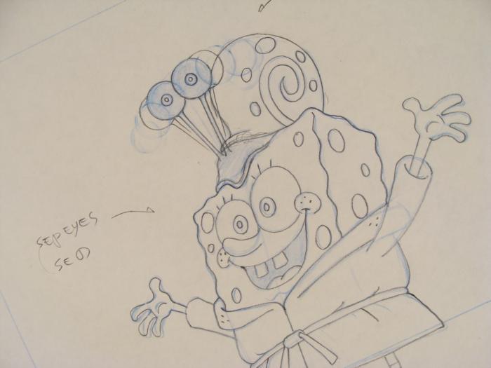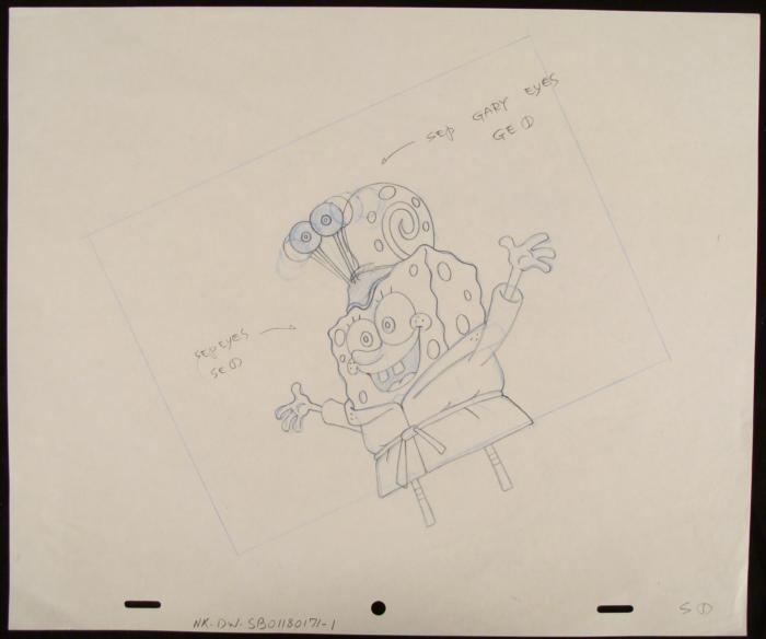 This original animation art pencil drawing was done for SpongeBob Squarepants. The notations say: Sep GARY EYES GE and Sep EYES SED. In this drawing, SpongeBob is showing off a cool trick: balancing Gary on his head.The story takes place under the deep blue sea in Bikini Bottom, where SpongeBob resides. SpongeBob, who is a yellow, porous sponge, is your typical happy-go-lucky character, as he is always cheerful and enjoys making people laugh. Patrick Star, SpongeBob's neighbor who is a starfish, is your average children's show idiot, as he boasts knowing nothing and is often getting himself into ridiculous situations. Between the homes of these two lies the home of the miserable Squidward, a squid, who is known for being grouchy and playing tricks on SpongeBob and Patrick. Both SpongeBob and Squidward work at the Krusty Krab, a fast food business run by the greedy money-loving Mr. Krabs, a crab, the arch rival of the evil, possibly misunderstood, Plankton. Another neighbor, Sandy Cheeks, an athletic squirrel who normally wears an astronaut's space suit, was introduced in "Tea at the Treedome." She spends most of her time inventing and experimenting. Original "rough" animation drawing, in black penci and non-phot blue with the notations in black. Overall size is a 12-field drawing that is 10 1/2" × 12 1/2" Excellent condition Traditional animation is a multi-step process which includes various types of art techniques. Drawings are a key part of the process, in which the animator creates the design and movement of the characters. Drawings are then transferred onto acetate cels (by hand-inking and/or photo copying) to create a production cel, which is then hand painted on the back side, using paint colors chosen and approved by the creator of the series. This drawing is ready to framed and matted. The animator's notations are shown at the top and bottom of the drawing.