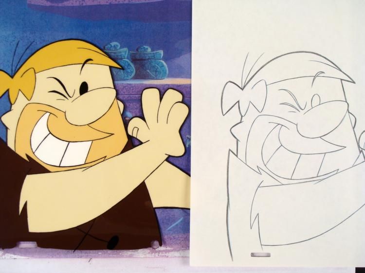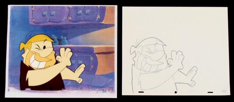 Don't worry, I got this one, "wink, wink..." The cel comes with a matching drawing overlay. * * Original Production Art Cel, Drawing, and Reproduction Background Original "rough" animation drawing, with notations in black. Barney has been outlined in black and non-photo blue * Overall Size of the Cel: 10 1/2" x 12 1/2" Overall Size of Reproduction Background: 11" x 13 1/4" * Excellent condition This is an original hand-painted cel set-up used in the production of an episode of "The Flintstones." Each one-of-a-kind set-up represents a slight change in position of the characters. When individually photographed and projected in rapid succession, the images appear to move. * To create production cels, the original animator's drawing is transferred onto an acetate cel (by hand-inking and/or photo copying). The cel is then hand-painted on the reverse side. The background accompanying this set-up is a reproduction background. * * The cel, drawing, and background are ready to be matted and framed. The animator's notations are shown at the bottom of the cel and drawing. *
