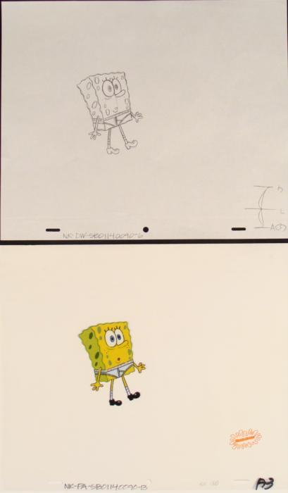 This original animation cel and drawing are from the Nickelodeon TV show SpongeBob Squarepants. The story takes place under the deep blue sea in Bikini Bottom, where SpongeBob resides. SpongeBob, who is a yellow, porous sponge, is your typical happy-go-lucky character, as he is always cheerful and enjoys making people laugh. Patrick Star, SpongeBob's neighbor who is a starfish, is your average children's show idiot, as he boasts knowing nothing and is often getting himself into ridiculous situations. Between the homes of these two lies the home of the miserable Squidward, a squid, who is known for being grouchy and playing tricks on SpongeBob and Patrick. Both SpongeBob and Squidward work at the Krusty Krab, a fast food business run by the greedy money-loving Mr. Krabs, a crab, the arch rival of the evil, possibly misunderstood, Plankton. Another neighbor, Sandy Cheeks, an athletic squirrel who normally wears an astronaut's space suit, was introduced in "Tea at the Treedome." She spends most of her time inventing and experimenting. The cel comes with a matching drawing overlay. Original Production Animated Cel and Drawing Original "rough" animation drawing, in black with notations in black. Overall Size of Drawing: 10 1/2" x 12 1/2" Overall Size of Cel: 10 1/2" x 12 1/2" Excellent ConditionThis is an original hand-painted cel set-up used in the production of an episode of "SpongeBob SquarePants." Each one-of-a-kind set-up represents a slight change in position of the characters. When individually photographed and projected in rapid succession, the images appear to move.