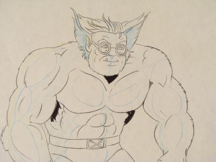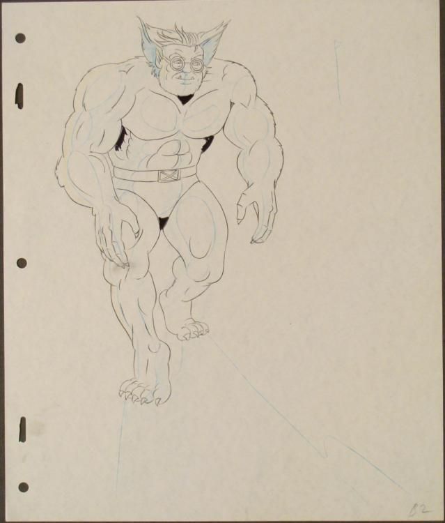 Under a cloud of increasing anti-mutant sentiment, Professor Xavier creates a haven at his Westchester mansion to train young mutants to use their powers for the benefit of humanity, and to prove mutants can be heroes. Xavier recruited Cyclops, Iceman, Angel, * Beast and Jean Grey calling them "X-Men" because they possessed the "x-gene", an ability normal humans lacked. Early issues introduced the team's arch enemy, Magneto and his Brotherhood of Evil Mutants, who would later battle the X-Men for years. * * It appears Beast is taking a gingerly stroll, giving his a brain a rest for once... * * * * * Original "rough" animation drawing, in non-photo blue, black pencil, and yellow, with the notations in black. Parts of Beast's body are shaded in with a black sharpie. * * Overall size is a 12-field drawing that is 10 1/2" × 12 1/2" * Excellent condition * Traditional animation is a multi-step process which includes various types of art techniques. Drawings are a key part of the process, in which the animator creates the design and movement of the characters. Drawings are then transferred onto acetate cels * (by hand-inking and/or photo copying) to create a production cel, which is then hand painted on the back side, using paint colors chosen and approved by the creator of the series. * * * This drawing is ready to framed and matted. The animator's notations are shown at the bottom of the drawing. The drawing comes in a protective sleeve. * * * * *